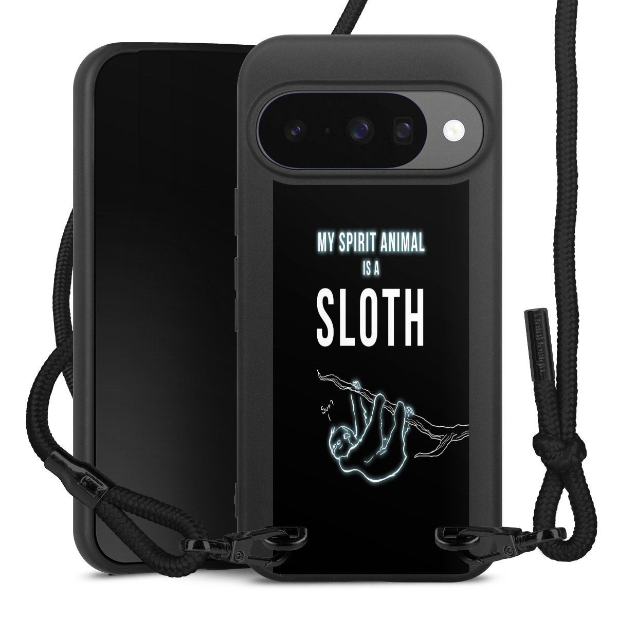 Pure Black: Handyhülle, Stoffband und Metalldetails in stylischem Mattschwarz.