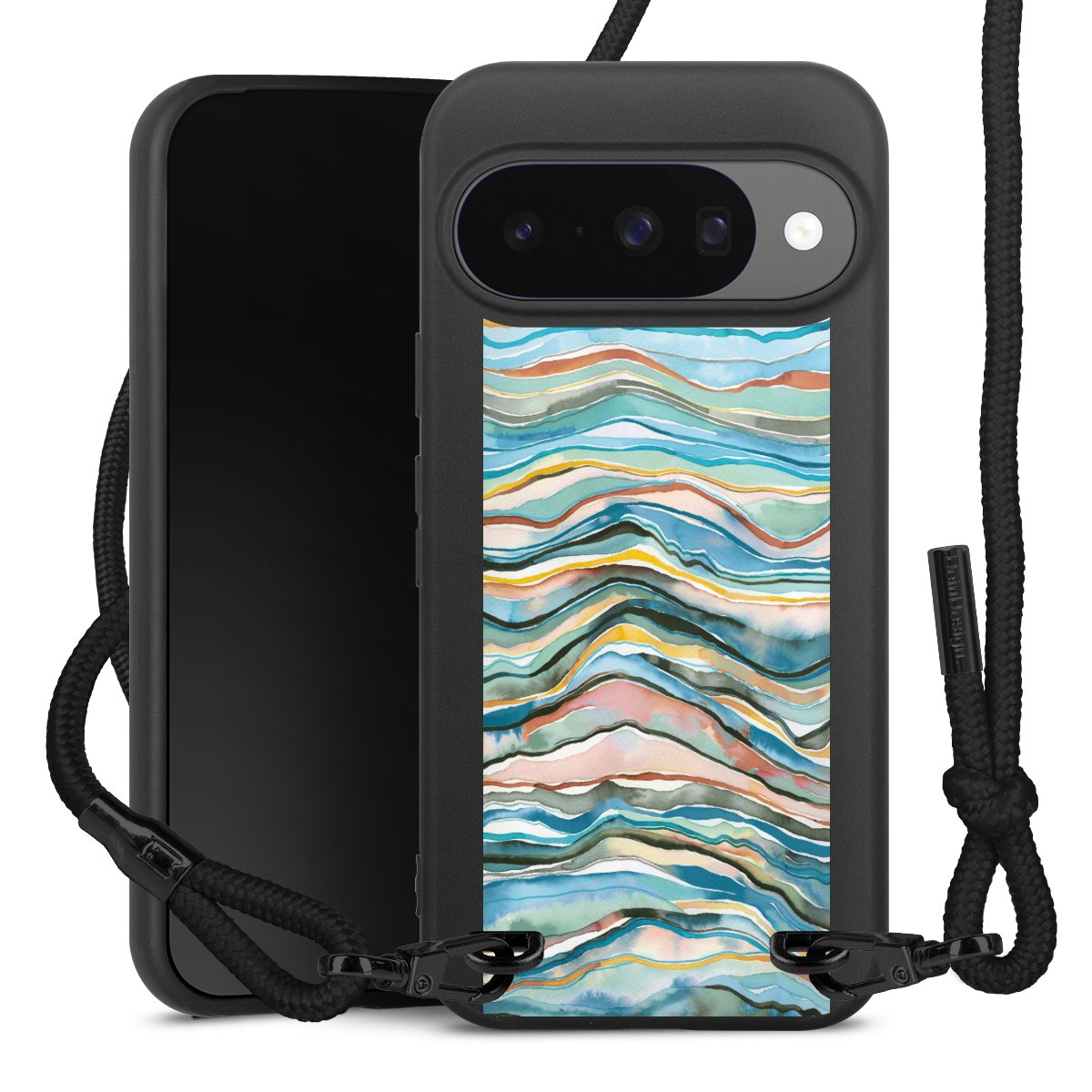 Pure Black: Handyhülle, Stoffband und Metalldetails in stylischem Mattschwarz.