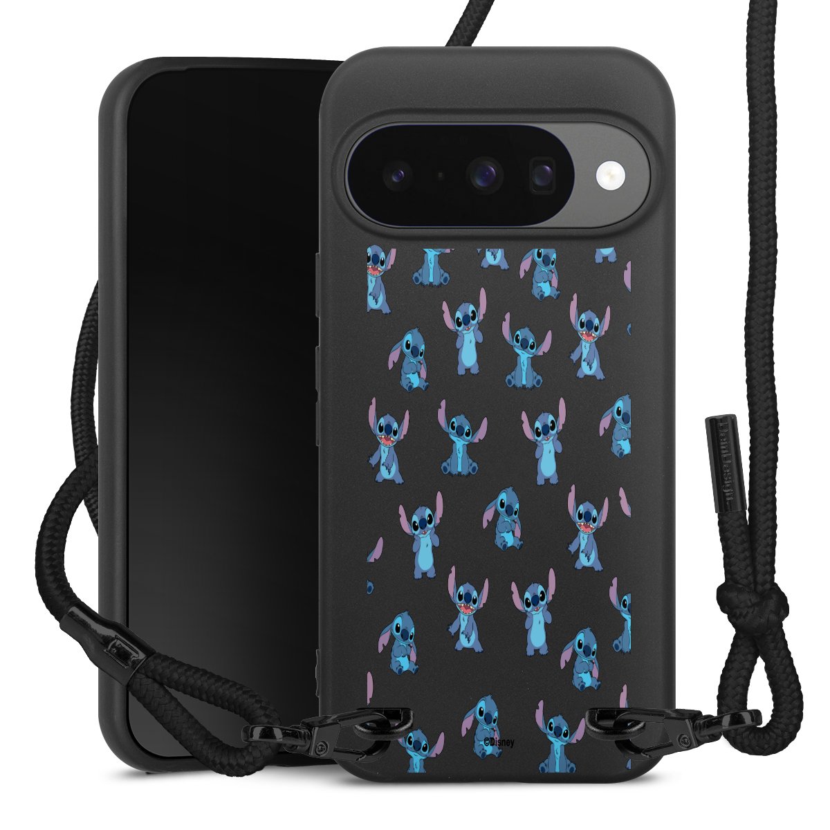 Pure Black: Handyhülle, Stoffband und Metalldetails in stylischem Mattschwarz.