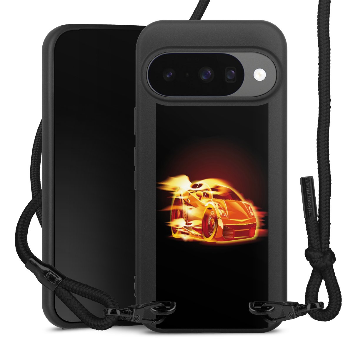 Pure Black: Handyhülle, Stoffband und Metalldetails in stylischem Mattschwarz.