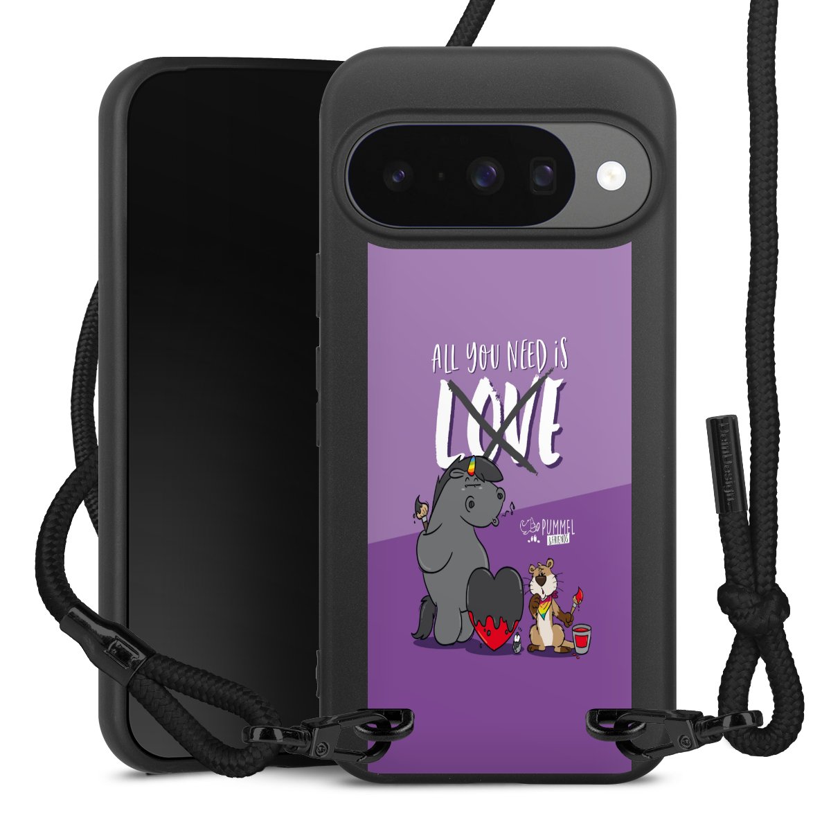 Pure Black: Handyhülle, Stoffband und Metalldetails in stylischem Mattschwarz.