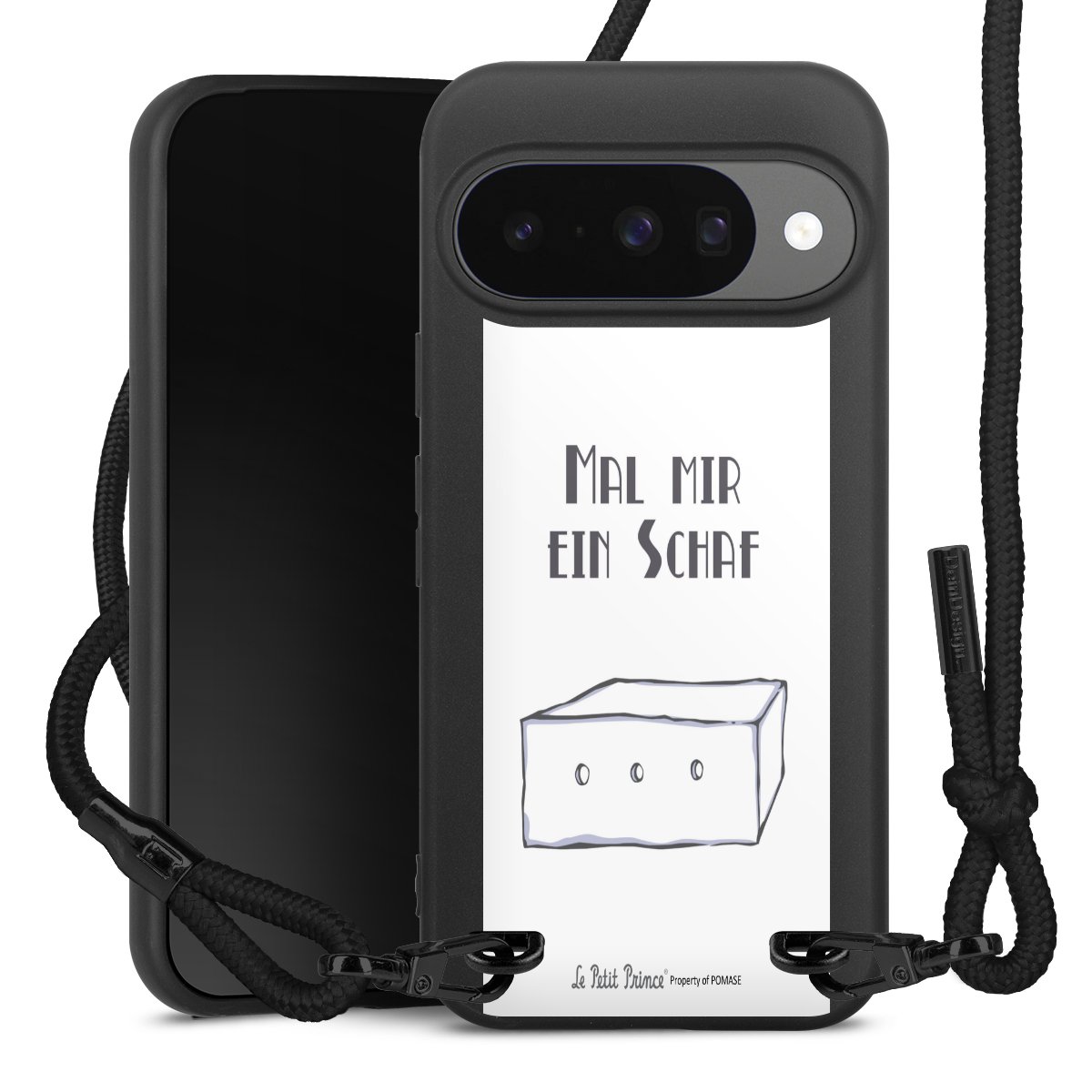 Pure Black: Handyhülle, Stoffband und Metalldetails in stylischem Mattschwarz.