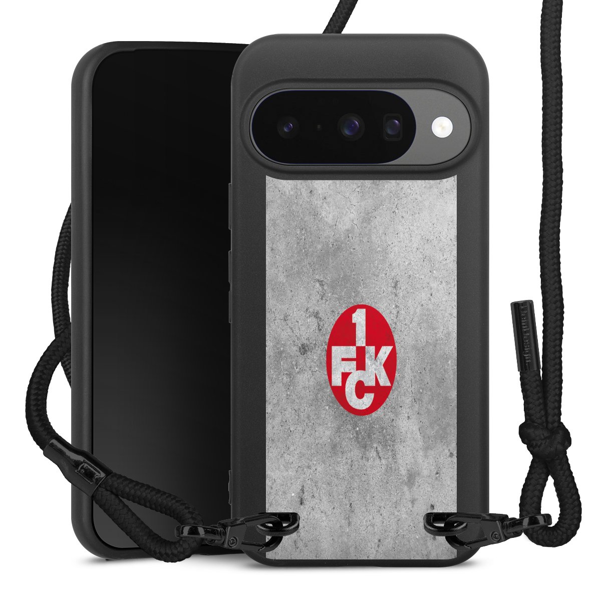 Pure Black: Handyhülle, Stoffband und Metalldetails in stylischem Mattschwarz.