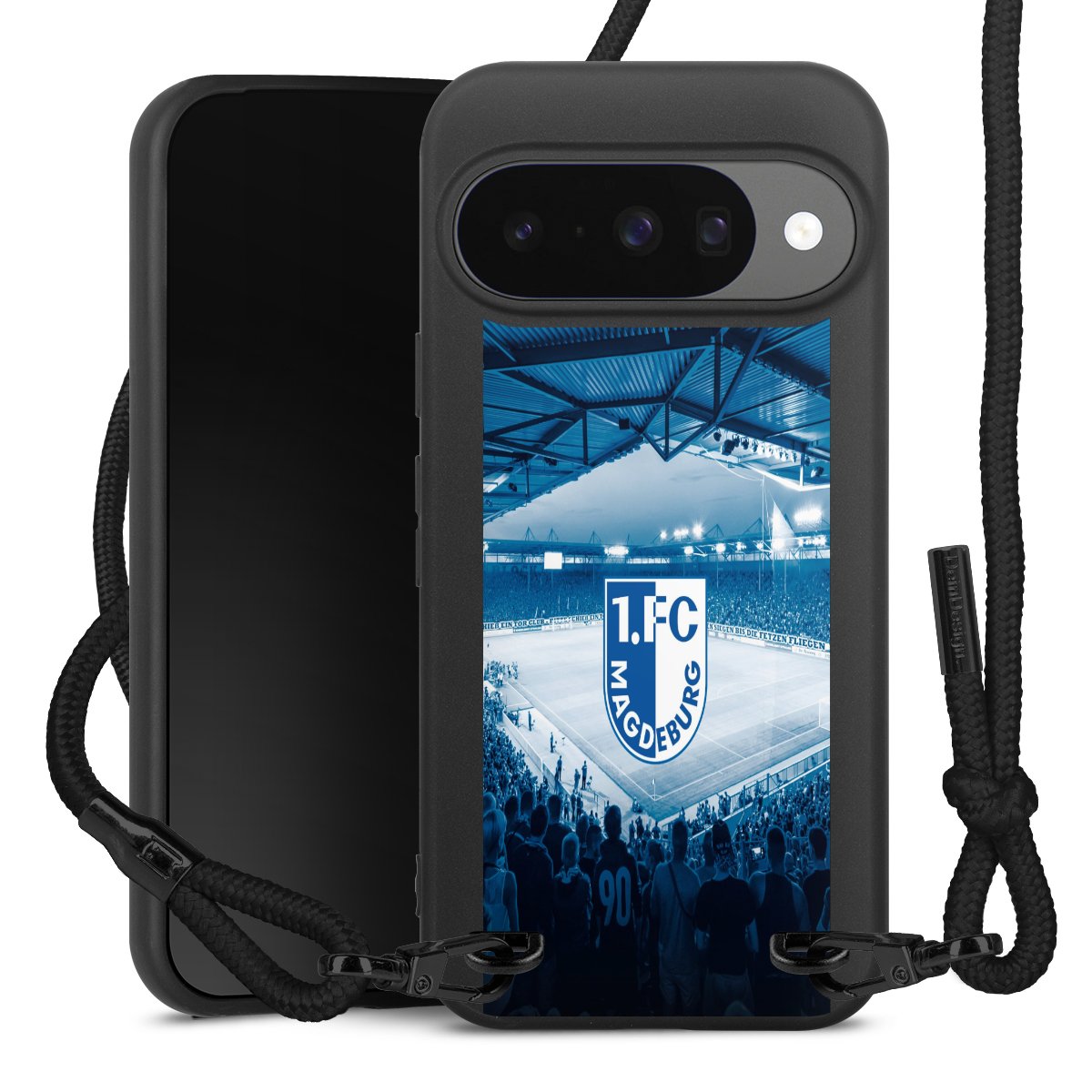 Pure Black: Handyhülle, Stoffband und Metalldetails in stylischem Mattschwarz.