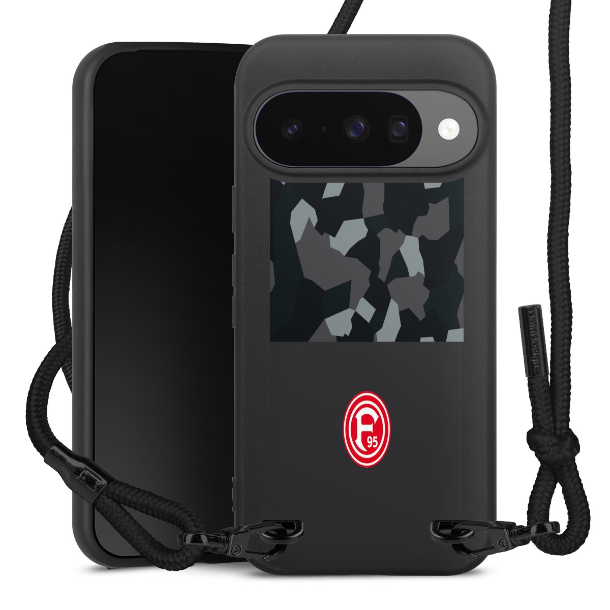 Pure Black: Handyhülle, Stoffband und Metalldetails in stylischem Mattschwarz.