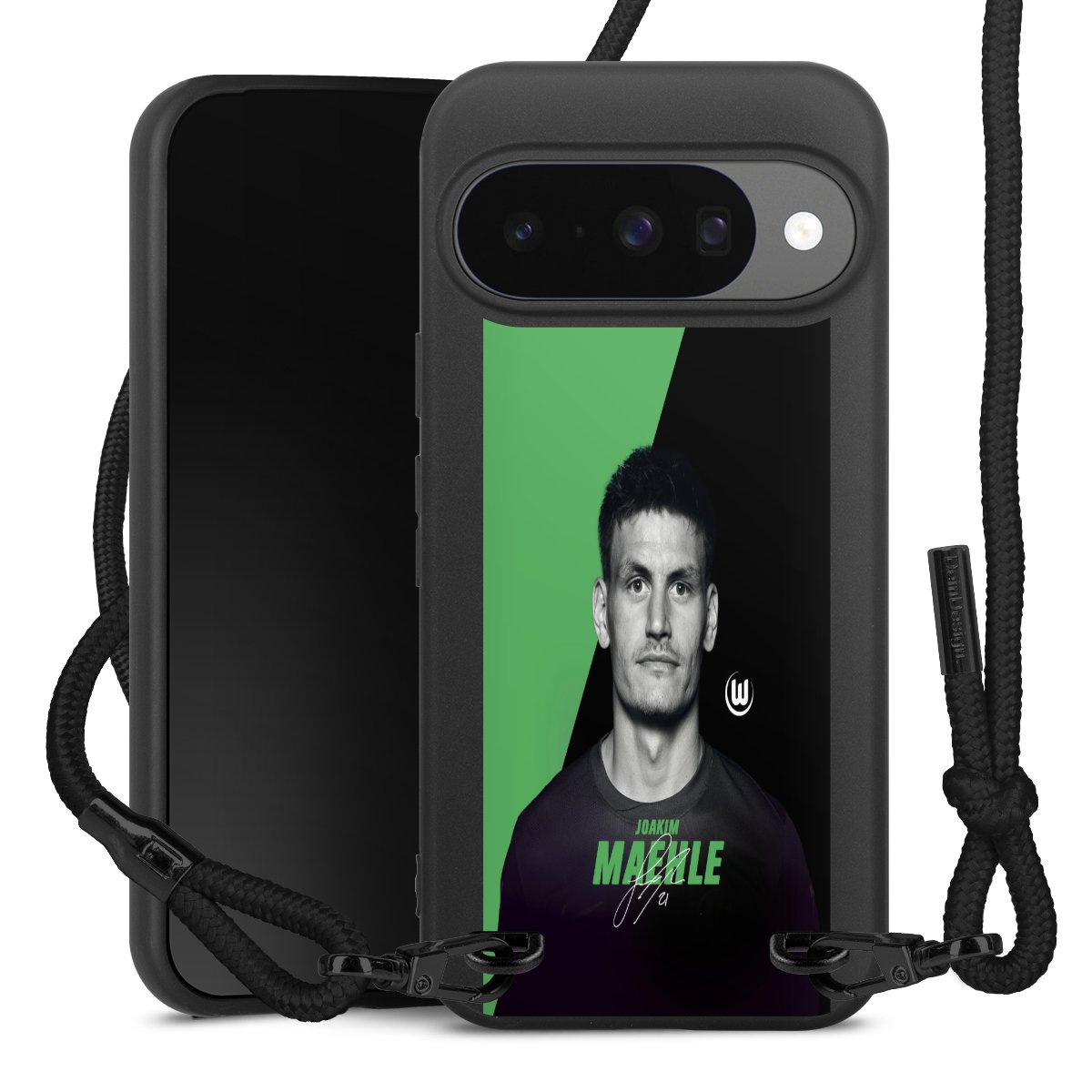 Pure Black: Handyhülle, Stoffband und Metalldetails in stylischem Mattschwarz.