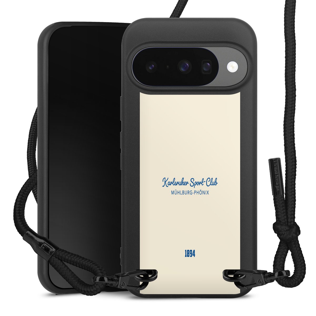 Pure Black: Handyhülle, Stoffband und Metalldetails in stylischem Mattschwarz.