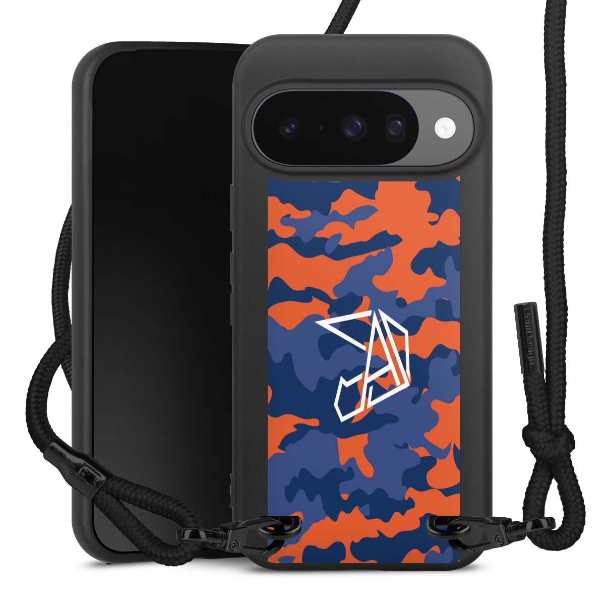 Pure Black: Handyhülle, Stoffband und Metalldetails in stylischem Mattschwarz.