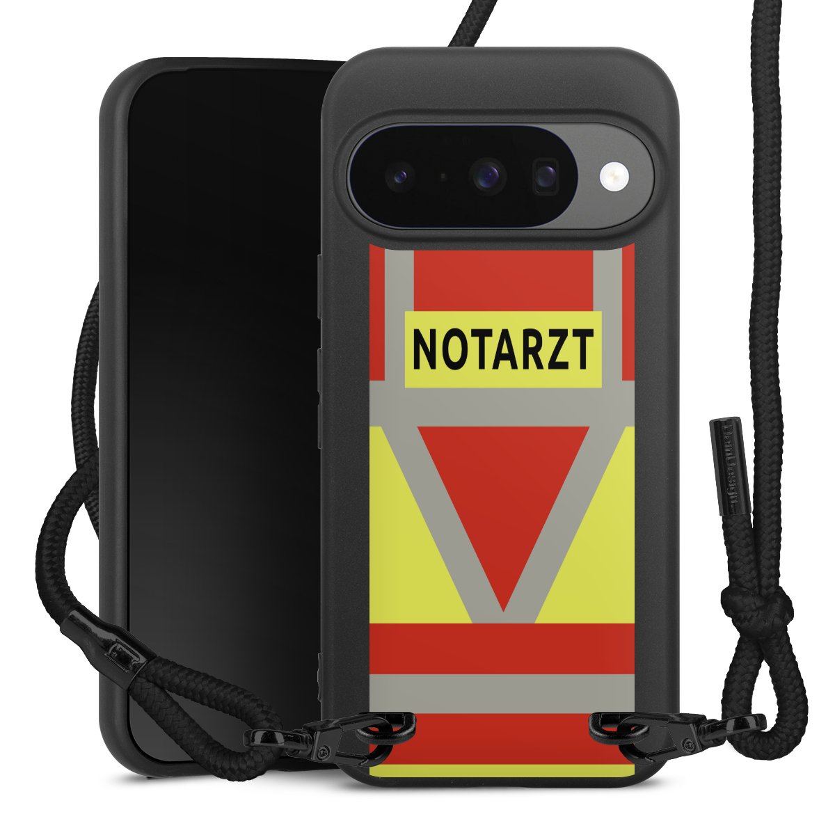 Pure Black: Handyhülle, Stoffband und Metalldetails in stylischem Mattschwarz.
