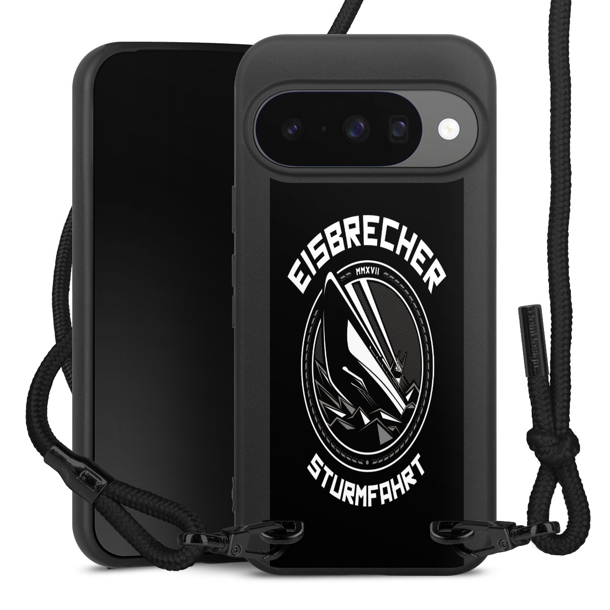 Pure Black: Handyhülle, Stoffband und Metalldetails in stylischem Mattschwarz.