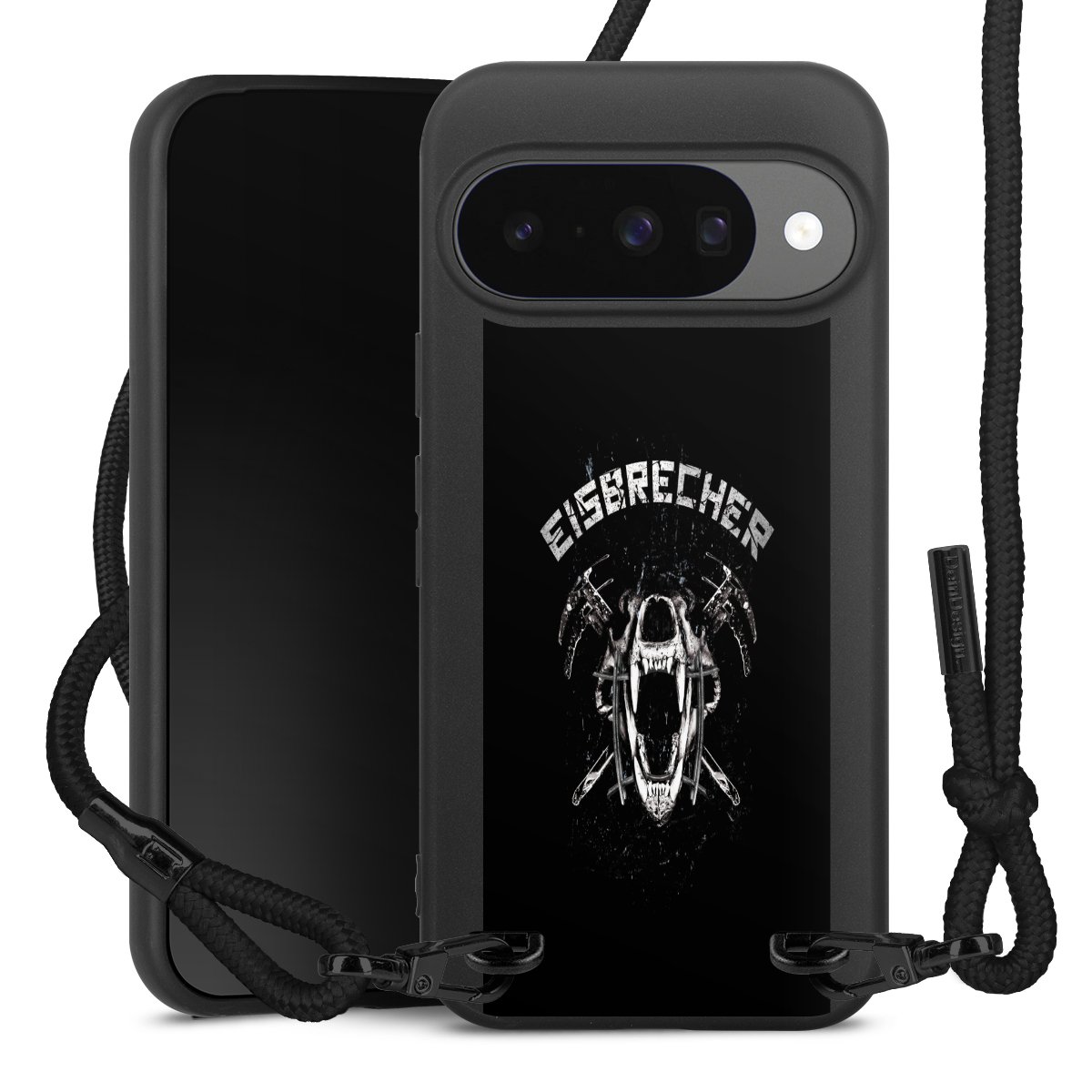 Pure Black: Handyhülle, Stoffband und Metalldetails in stylischem Mattschwarz.