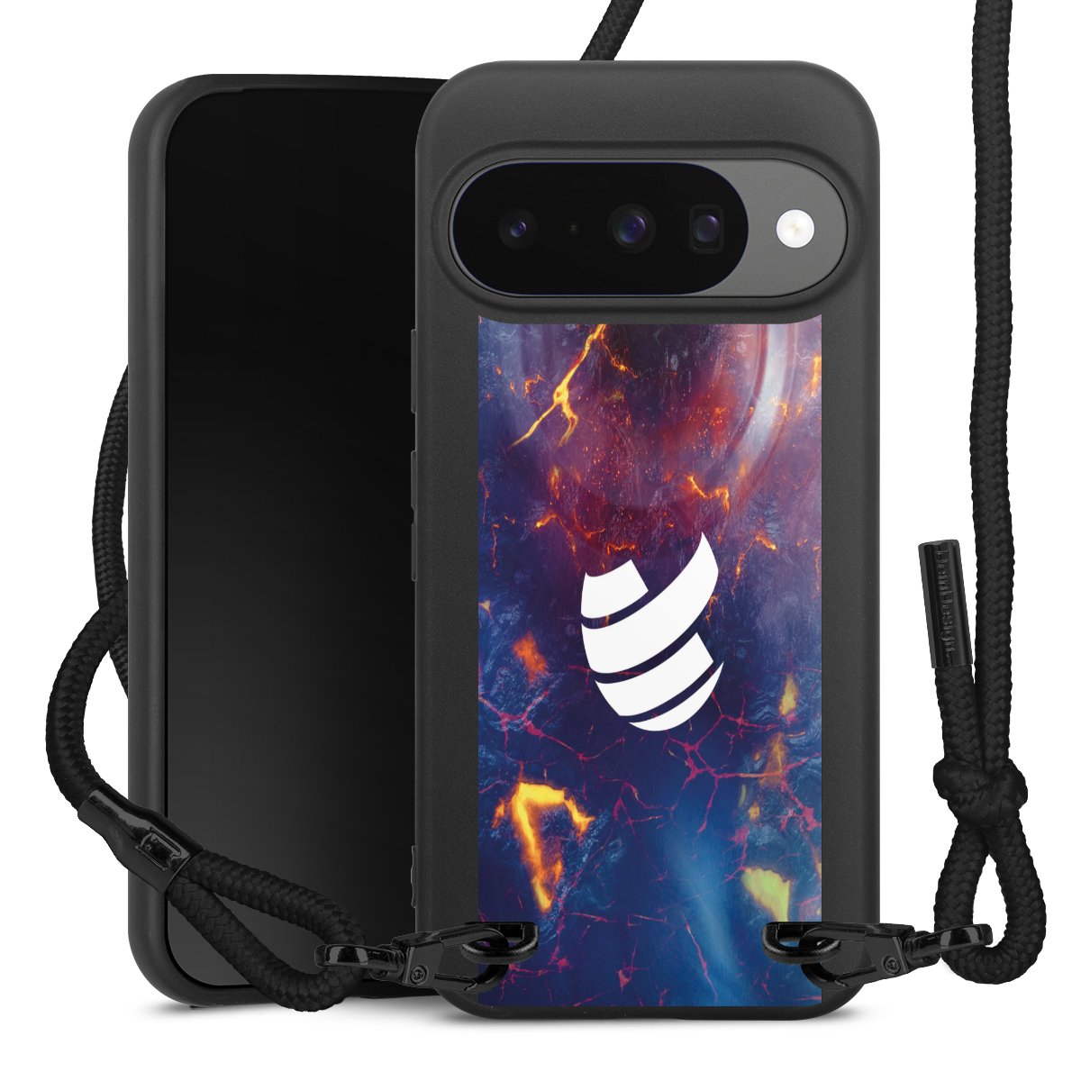 Pure Black: Handyhülle, Stoffband und Metalldetails in stylischem Mattschwarz.