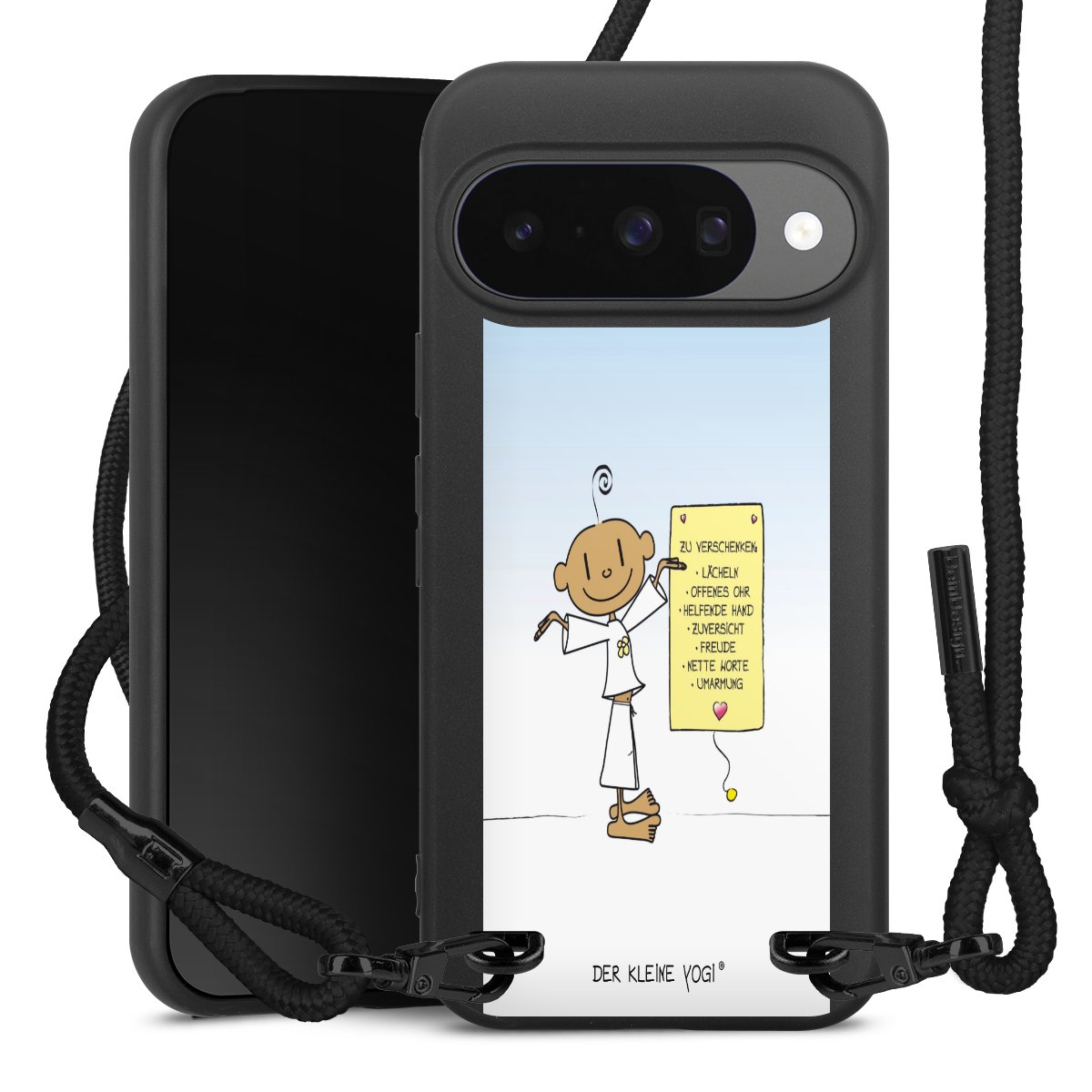 Pure Black: Handyhülle, Stoffband und Metalldetails in stylischem Mattschwarz.