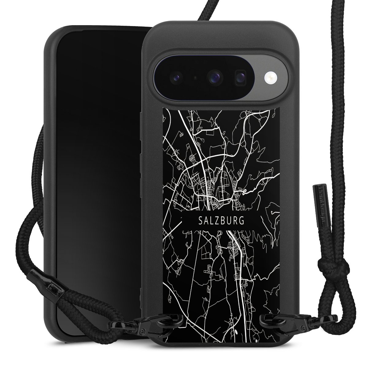 Pure Black: Handyhülle, Stoffband und Metalldetails in stylischem Mattschwarz.