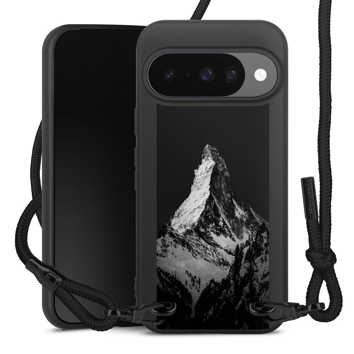 Pure Black: Handyhülle, Stoffband und Metalldetails in stylischem Mattschwarz.