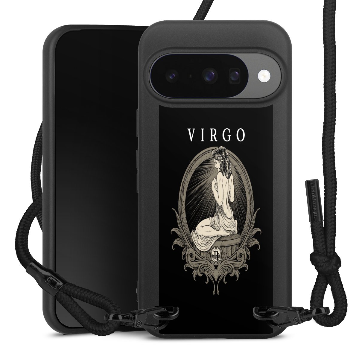Pure Black: Handyhülle, Stoffband und Metalldetails in stylischem Mattschwarz.