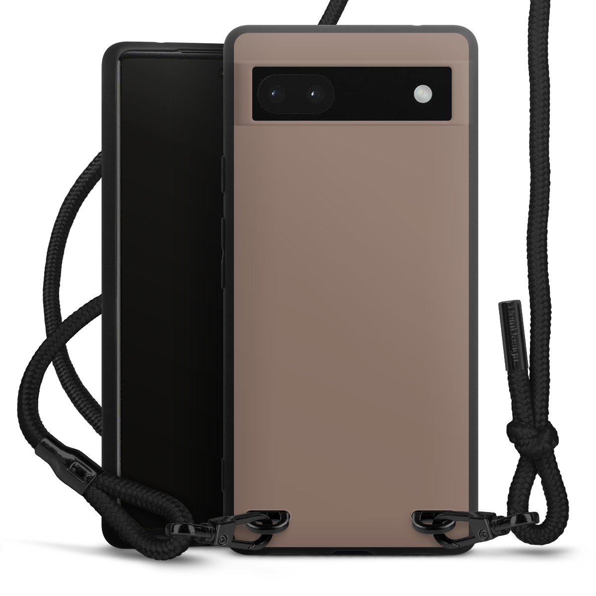 Pure Black: Handyhülle, Stoffband und Metalldetails in stylischem Mattschwarz.