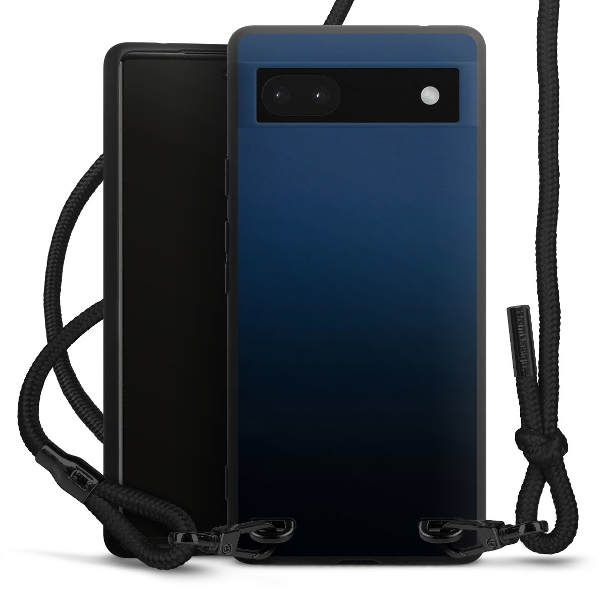 Pure Black: Handyhülle, Stoffband und Metalldetails in stylischem Mattschwarz.