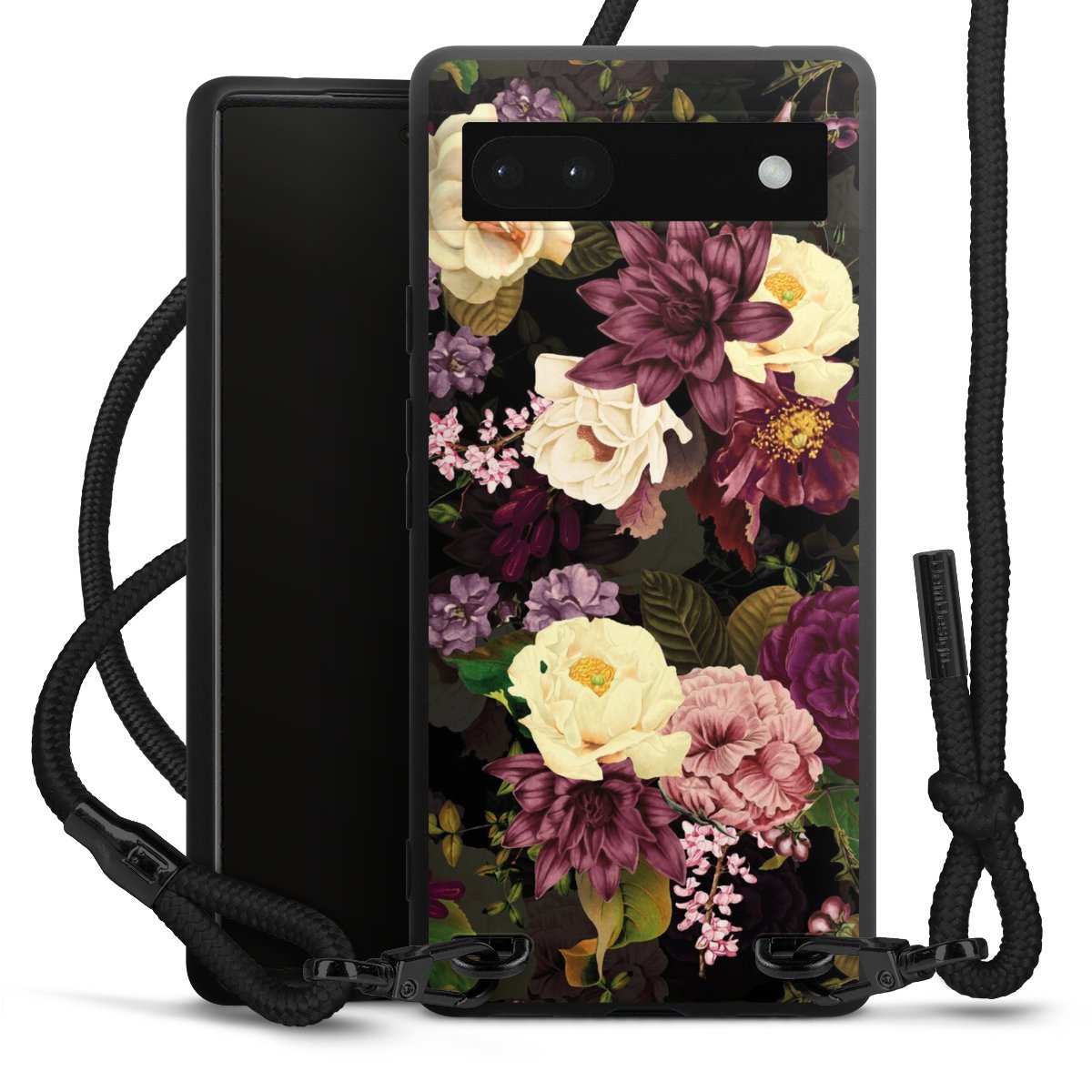 Pure Black: Handyhülle, Stoffband und Metalldetails in stylischem Mattschwarz.