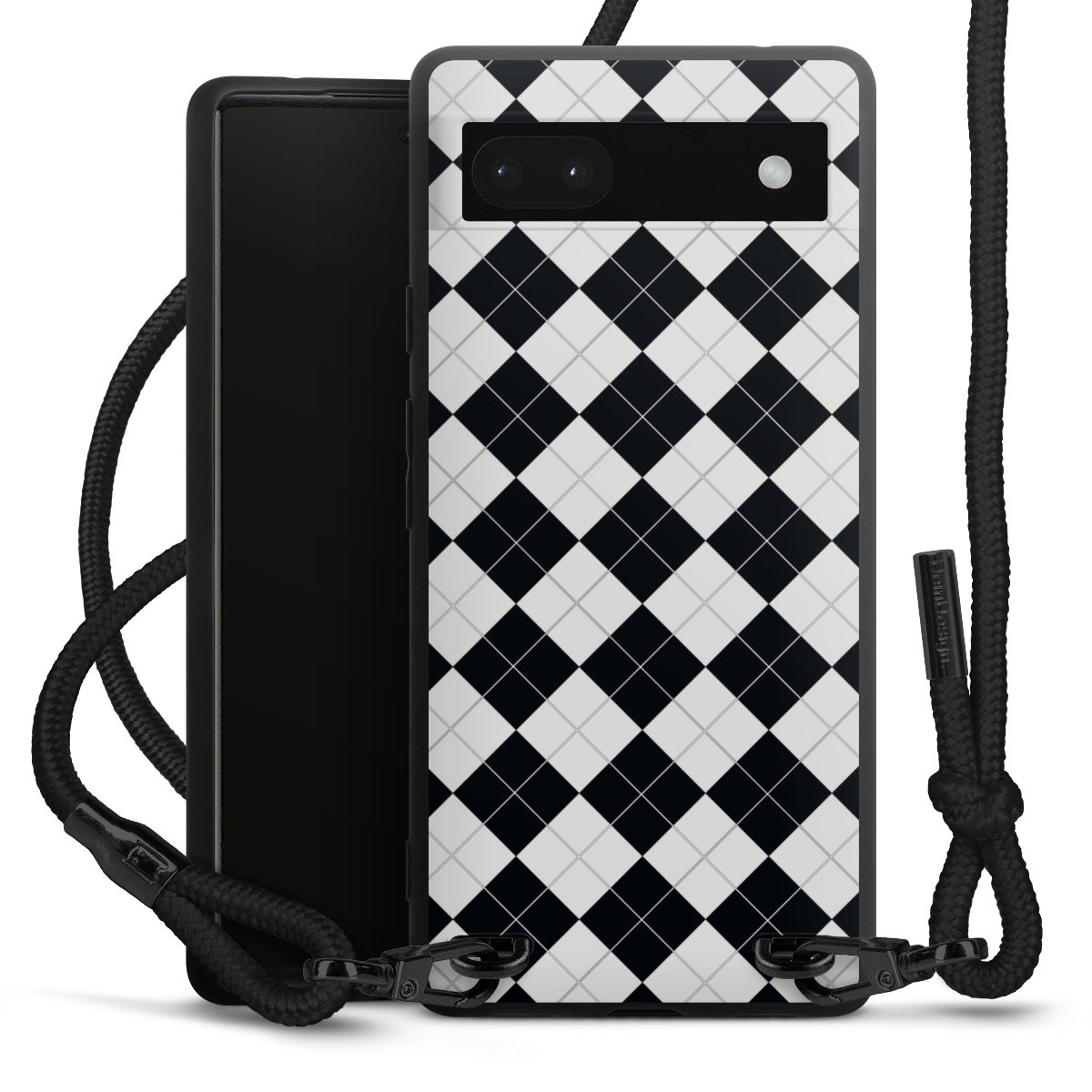 Pure Black: Handyhülle, Stoffband und Metalldetails in stylischem Mattschwarz.