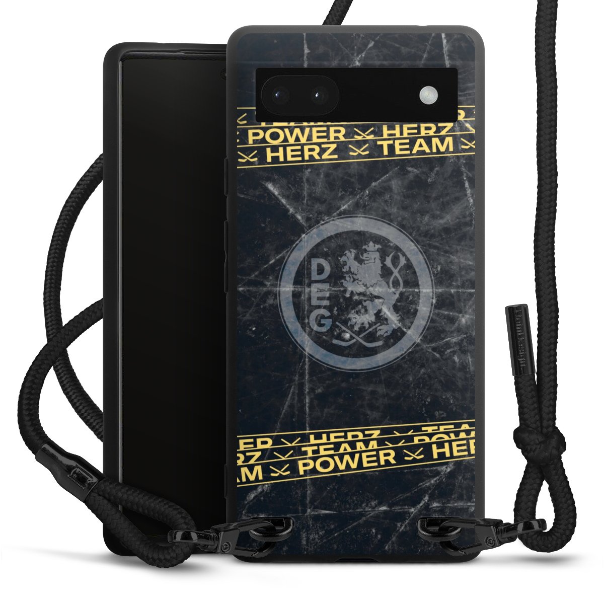 Pure Black: Handyhülle, Stoffband und Metalldetails in stylischem Mattschwarz.