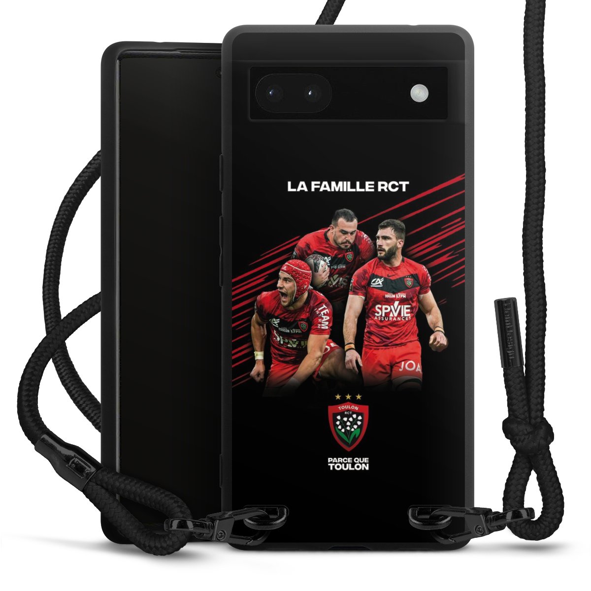 Pure Black: Handyhülle, Stoffband und Metalldetails in stylischem Mattschwarz.