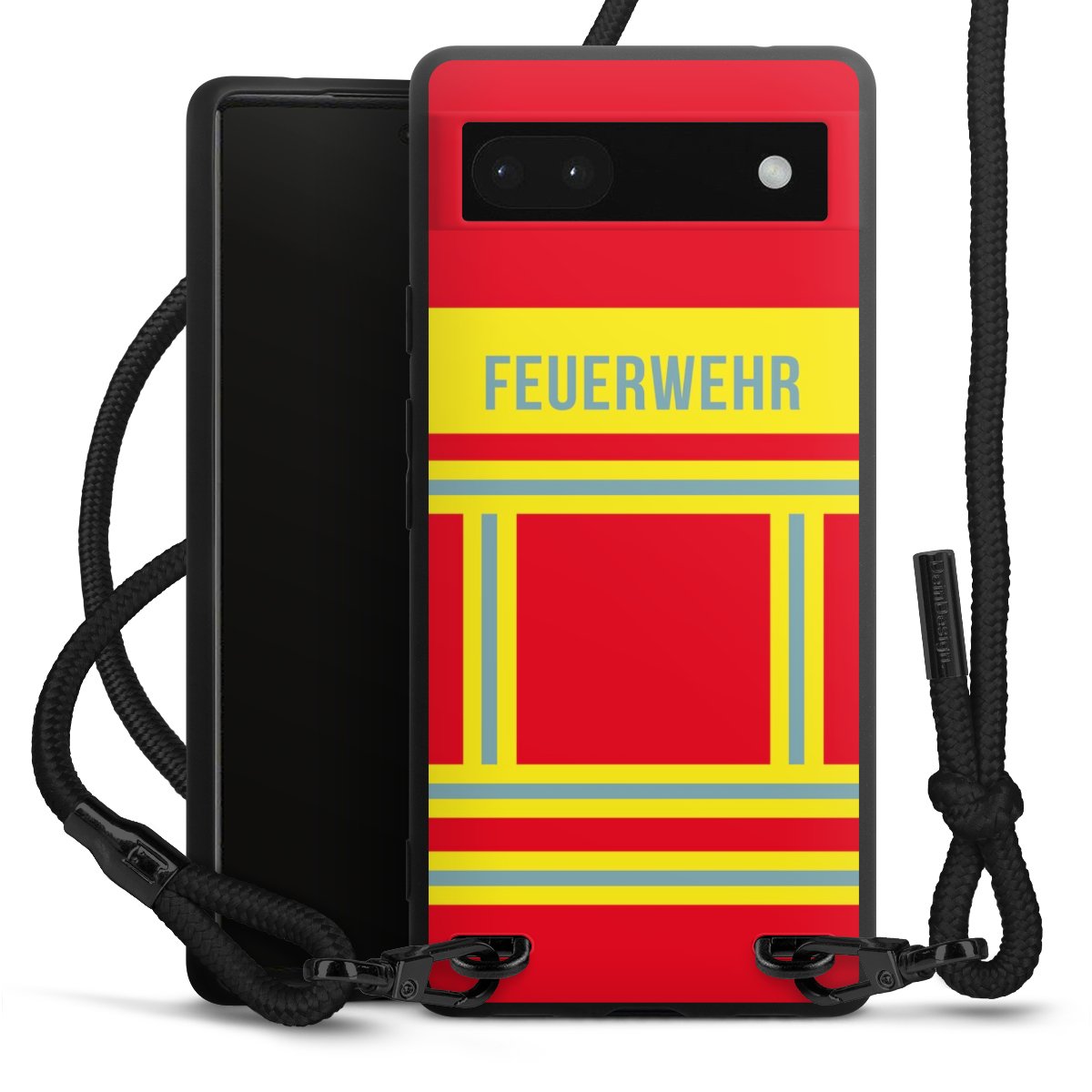 Pure Black: Handyhülle, Stoffband und Metalldetails in stylischem Mattschwarz.