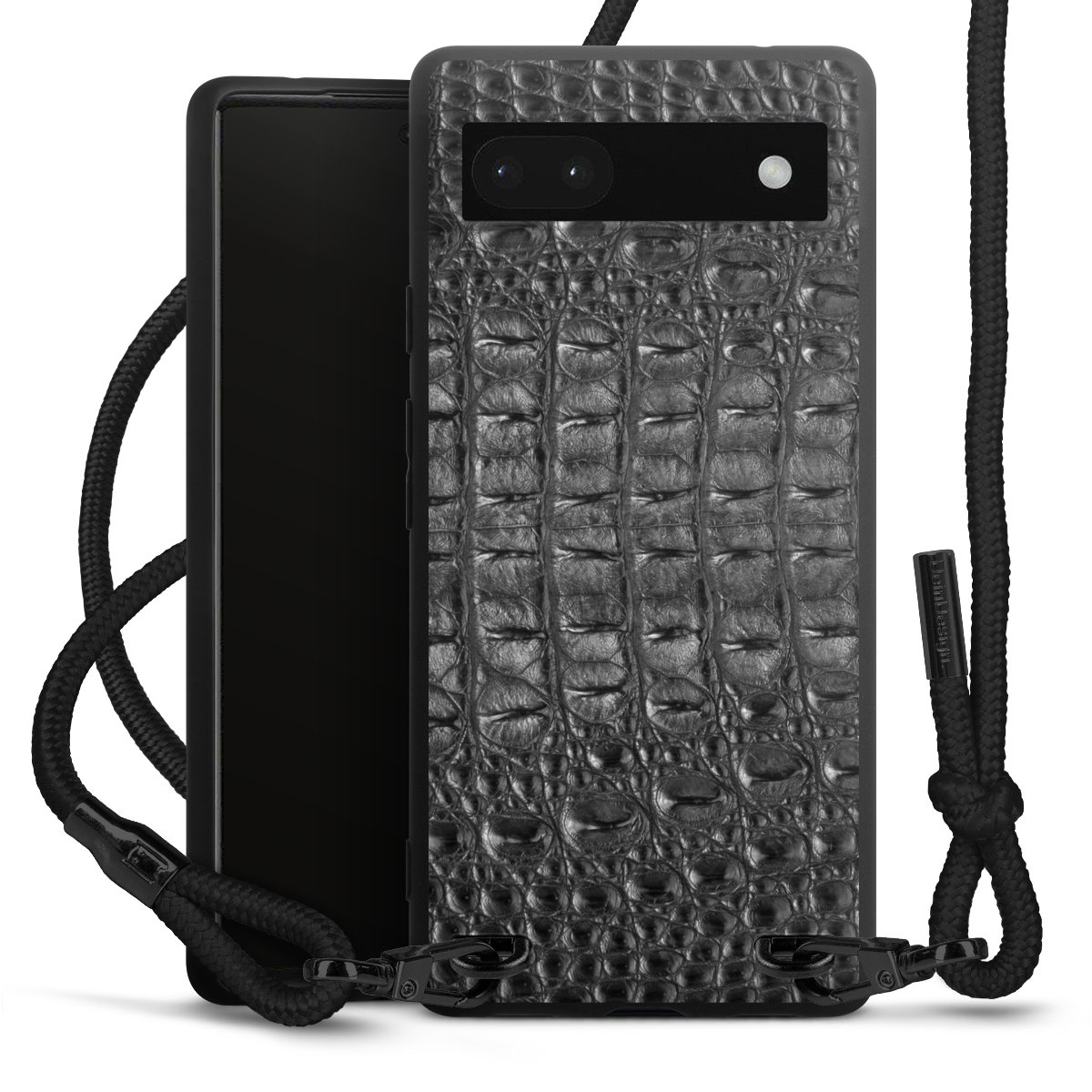 Pure Black: Handyhülle, Stoffband und Metalldetails in stylischem Mattschwarz.