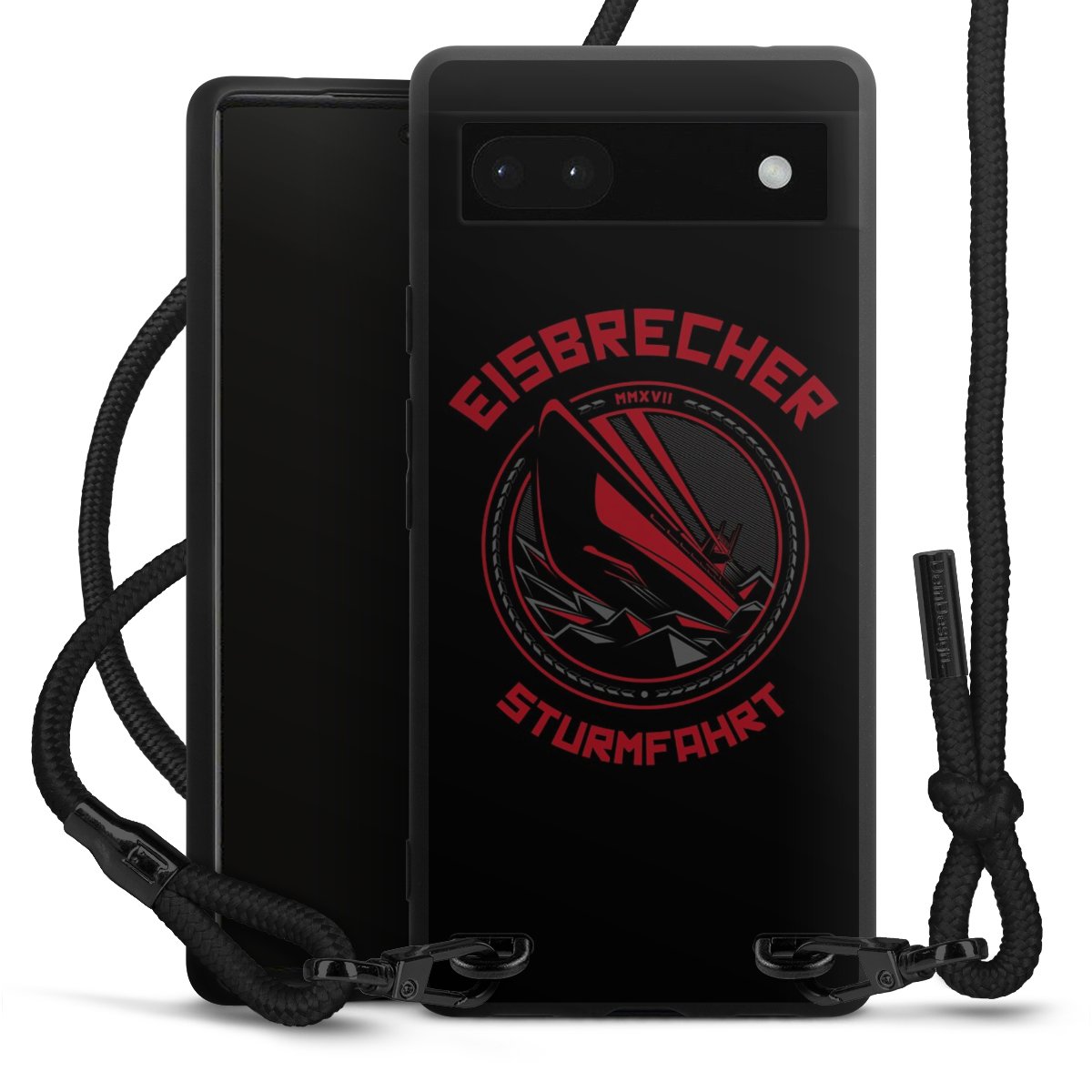 Pure Black: Handyhülle, Stoffband und Metalldetails in stylischem Mattschwarz.