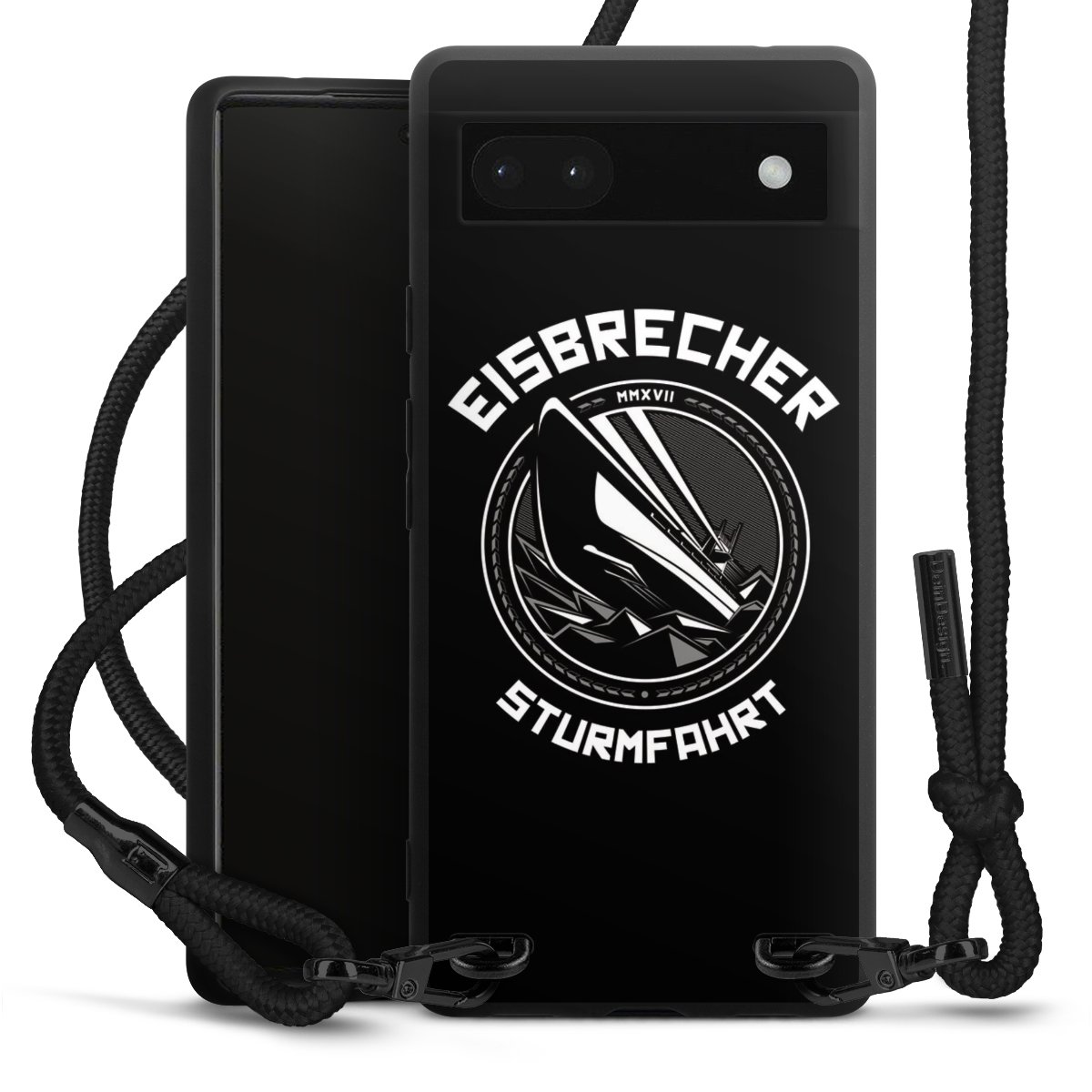 Pure Black: Handyhülle, Stoffband und Metalldetails in stylischem Mattschwarz.