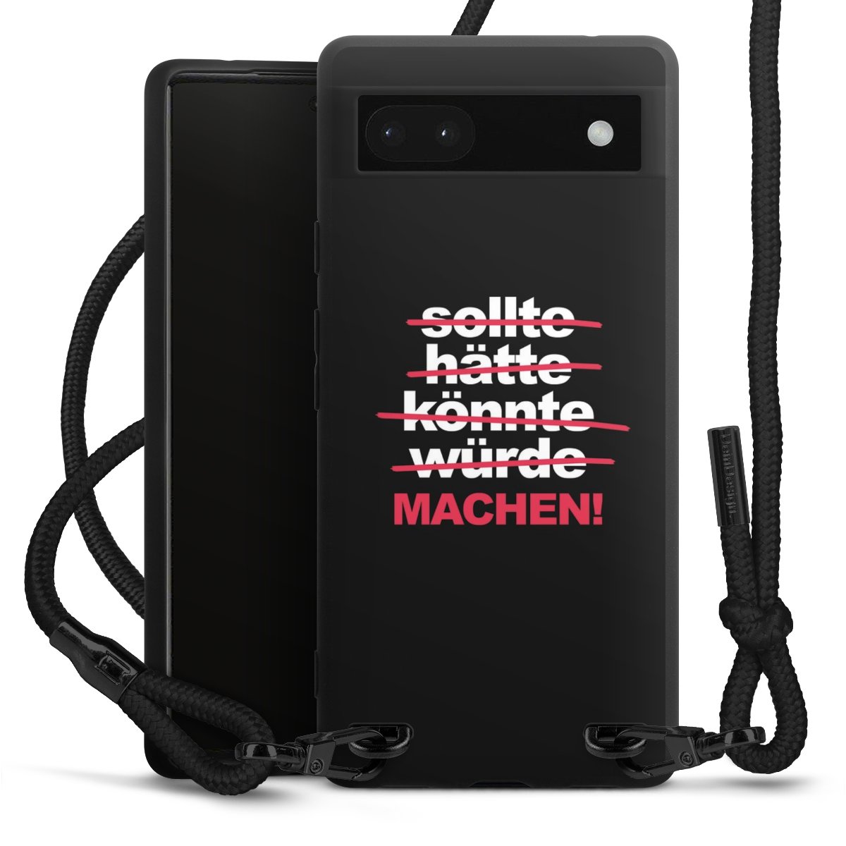 Pure Black: Handyhülle, Stoffband und Metalldetails in stylischem Mattschwarz.