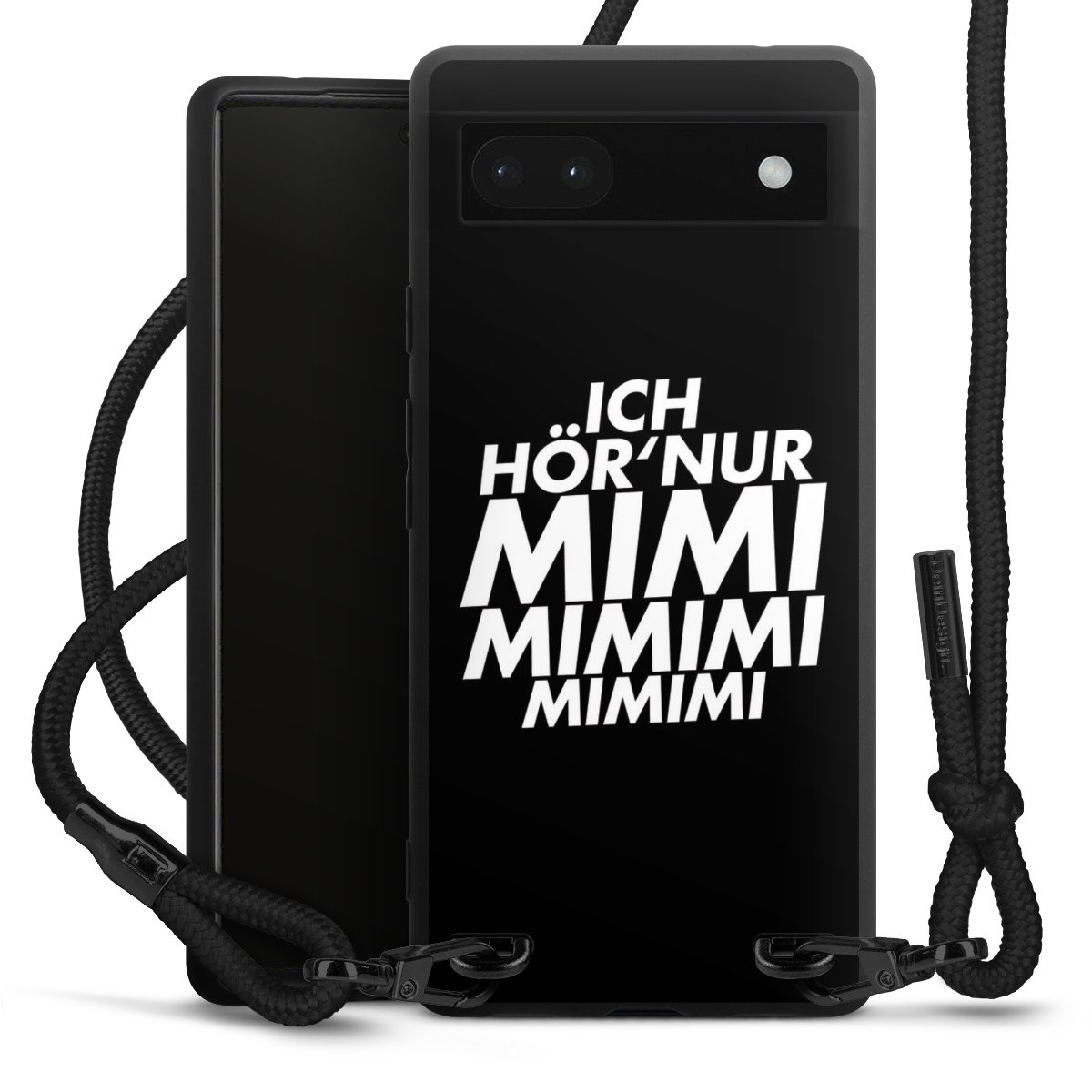 Pure Black: Handyhülle, Stoffband und Metalldetails in stylischem Mattschwarz.