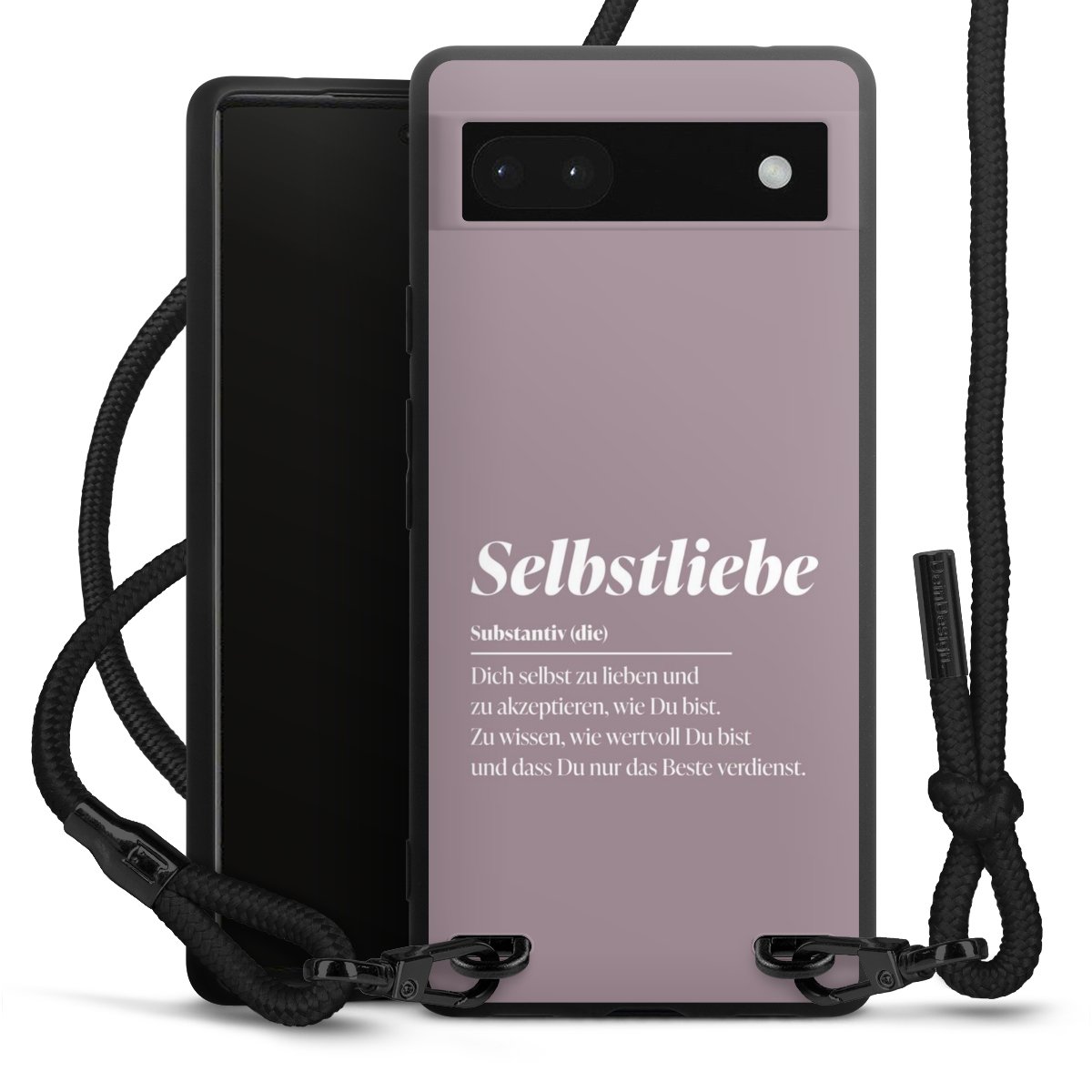 Pure Black: Handyhülle, Stoffband und Metalldetails in stylischem Mattschwarz.