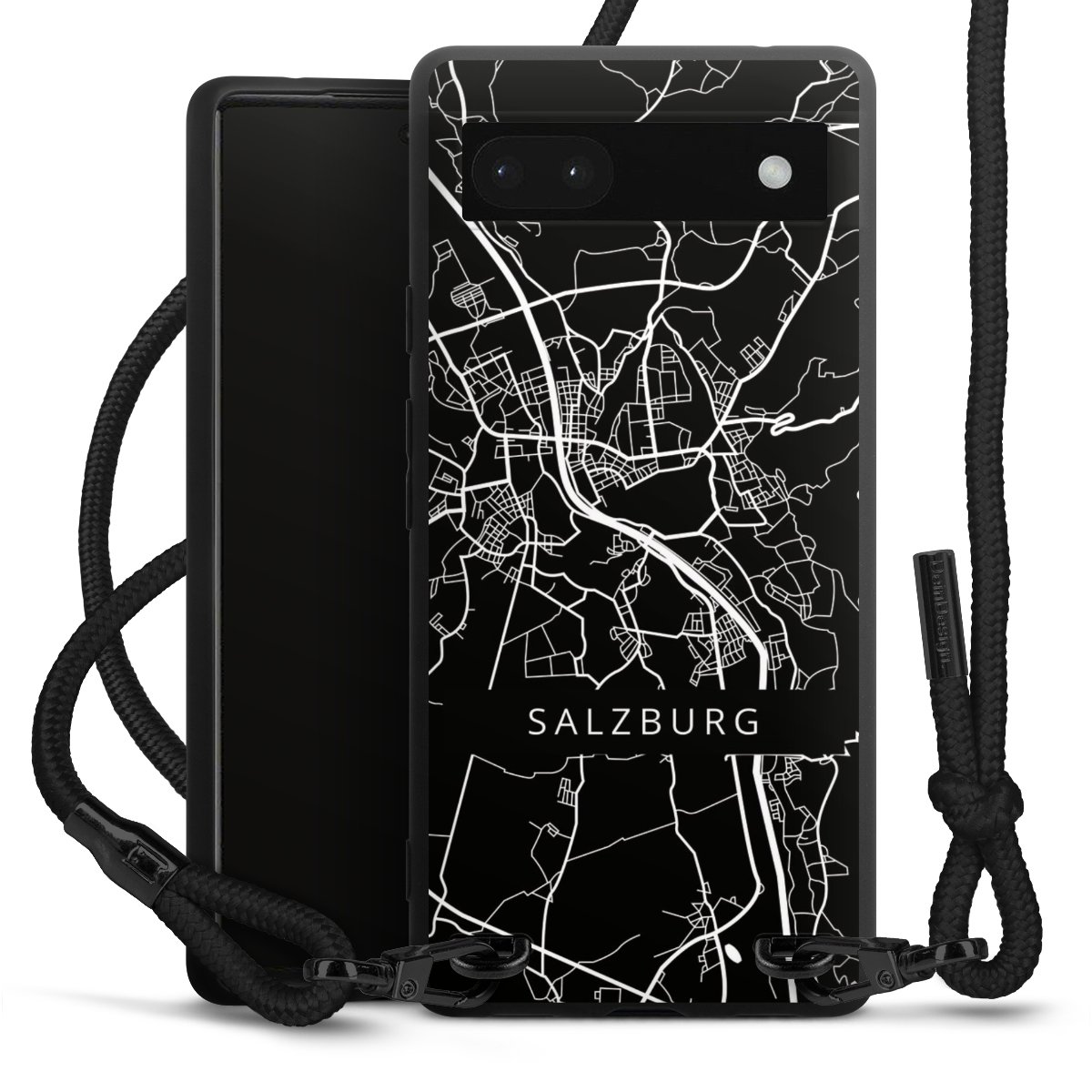 Pure Black: Handyhülle, Stoffband und Metalldetails in stylischem Mattschwarz.