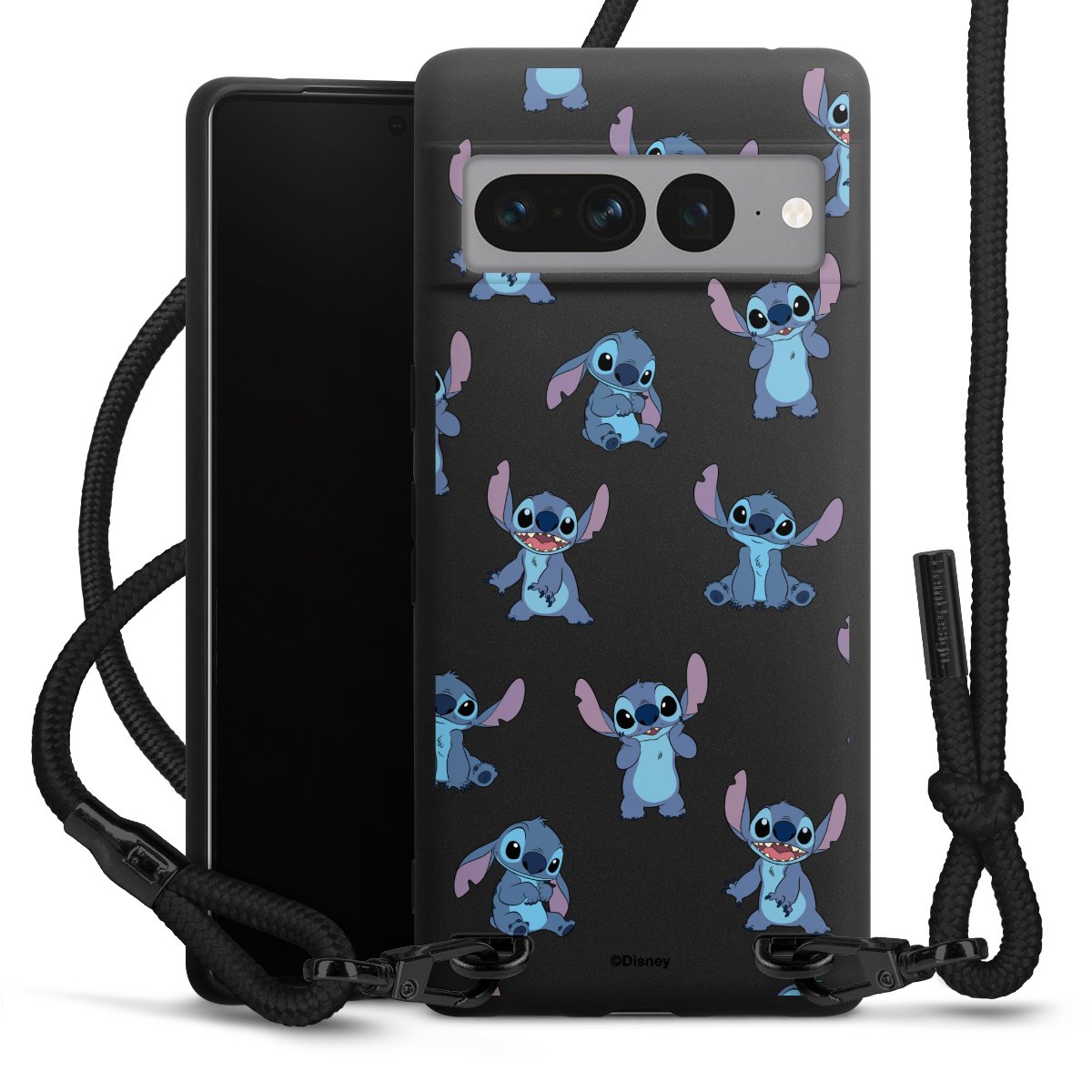 Pure Black: Handyhülle, Stoffband und Metalldetails in stylischem Mattschwarz.
