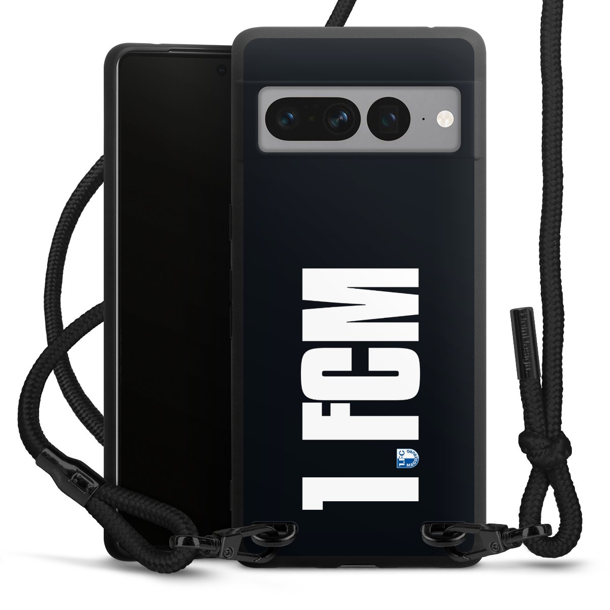 Pure Black: Handyhülle, Stoffband und Metalldetails in stylischem Mattschwarz.