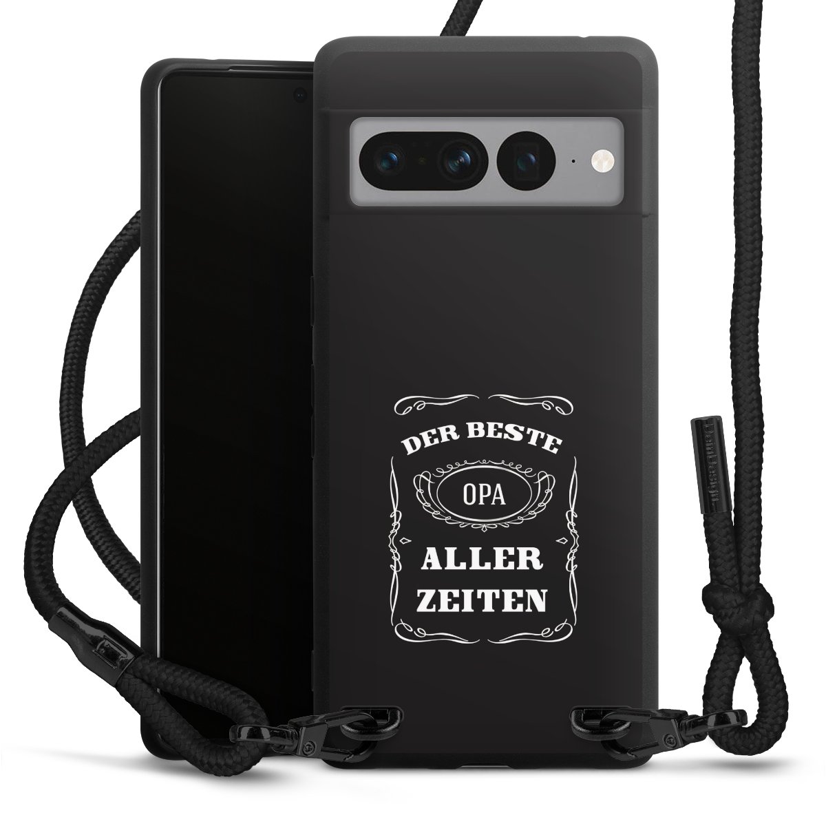 Pure Black: Handyhülle, Stoffband und Metalldetails in stylischem Mattschwarz.