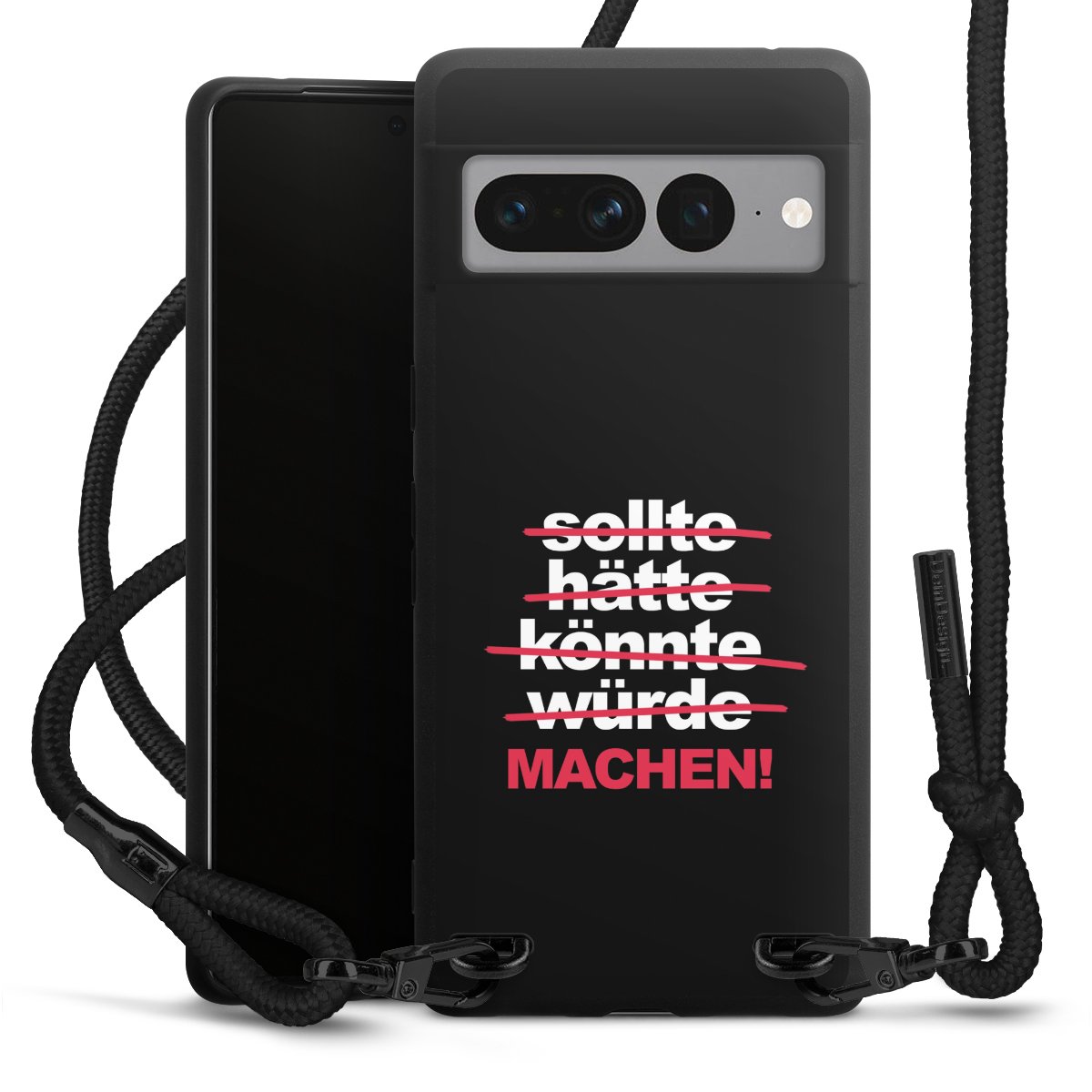 Pure Black: Handyhülle, Stoffband und Metalldetails in stylischem Mattschwarz.