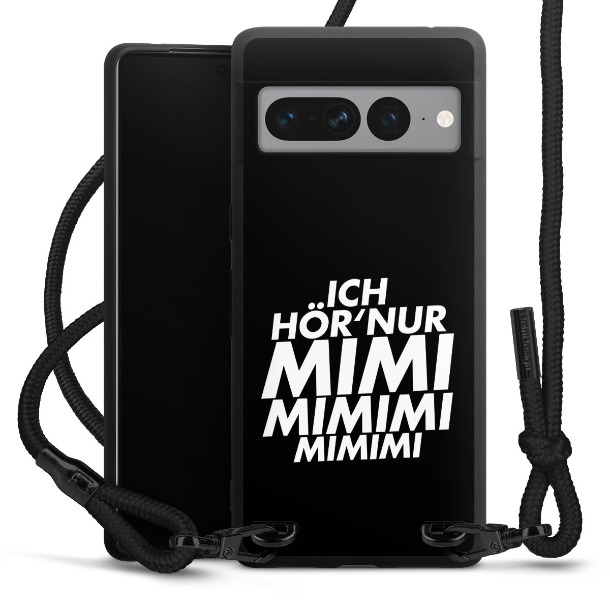 Pure Black: Handyhülle, Stoffband und Metalldetails in stylischem Mattschwarz.