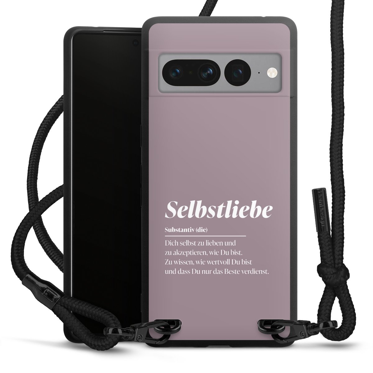 Pure Black: Handyhülle, Stoffband und Metalldetails in stylischem Mattschwarz.