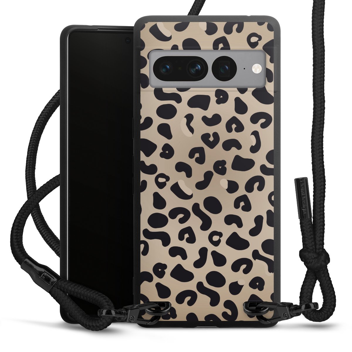 Pure Black: Handyhülle, Stoffband und Metalldetails in stylischem Mattschwarz.