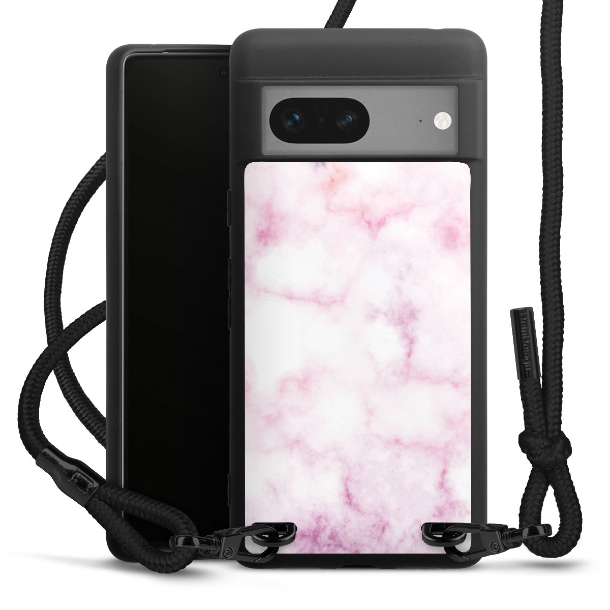 Pure Black: Handyhülle, Stoffband und Metalldetails in stylischem Mattschwarz.