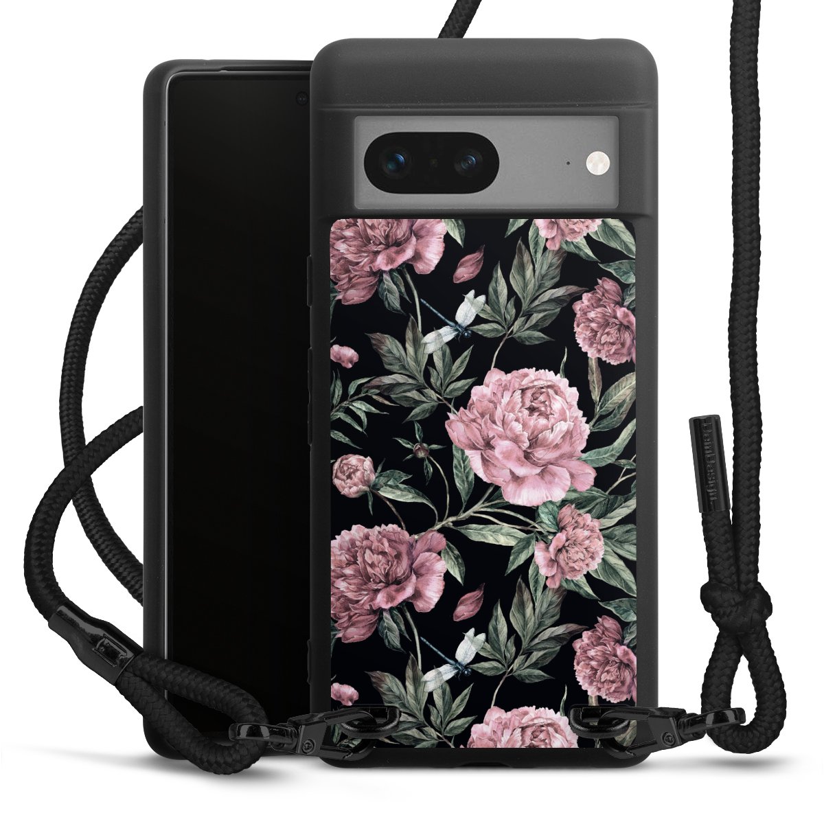 Pure Black: Handyhülle, Stoffband und Metalldetails in stylischem Mattschwarz.