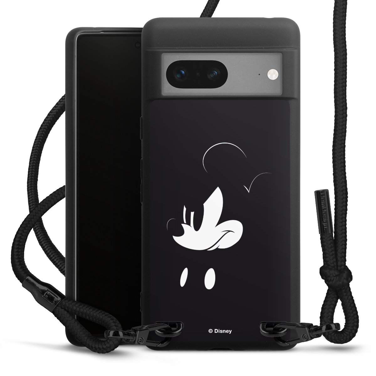 Pure Black: Handyhülle, Stoffband und Metalldetails in stylischem Mattschwarz.
