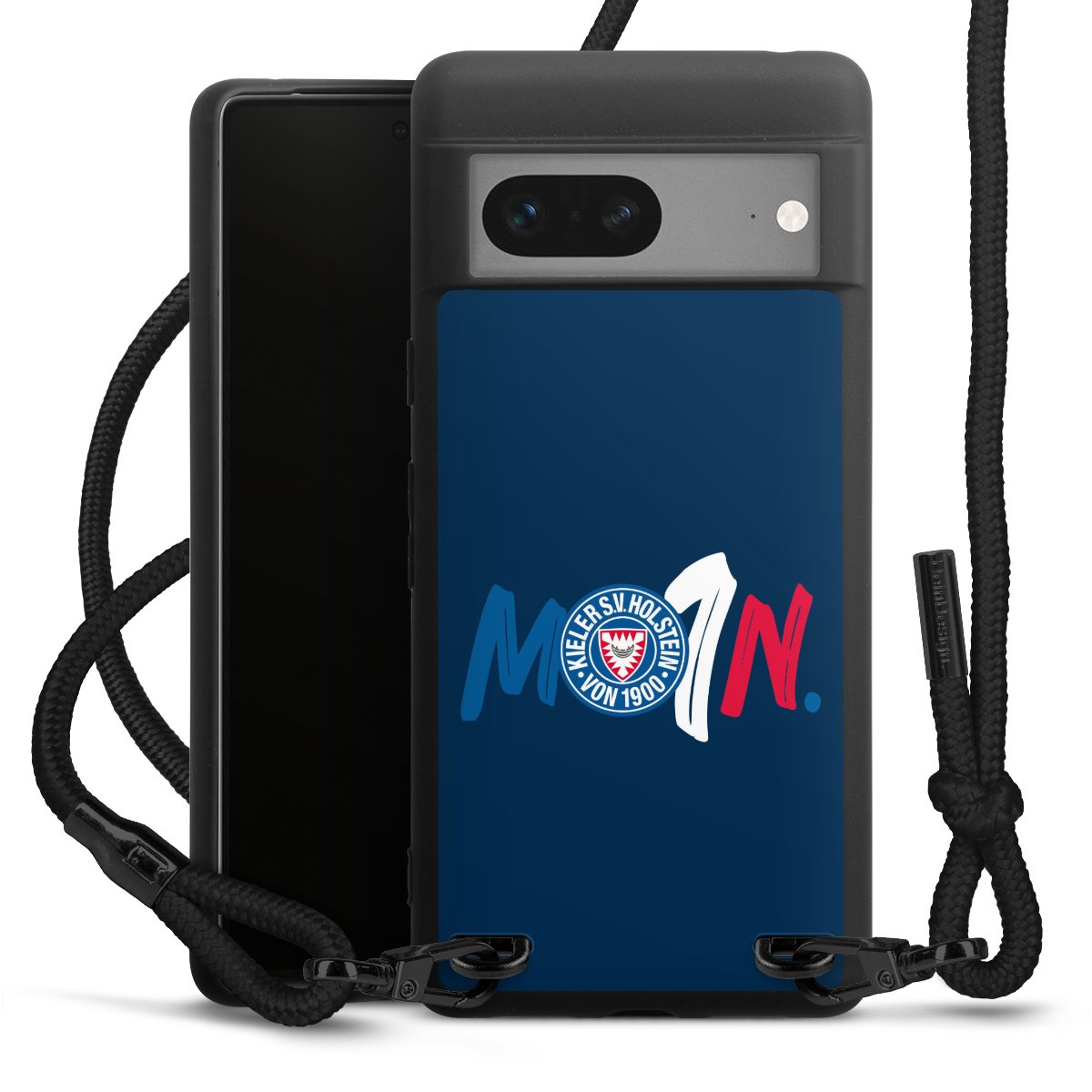 Pure Black: Handyhülle, Stoffband und Metalldetails in stylischem Mattschwarz.