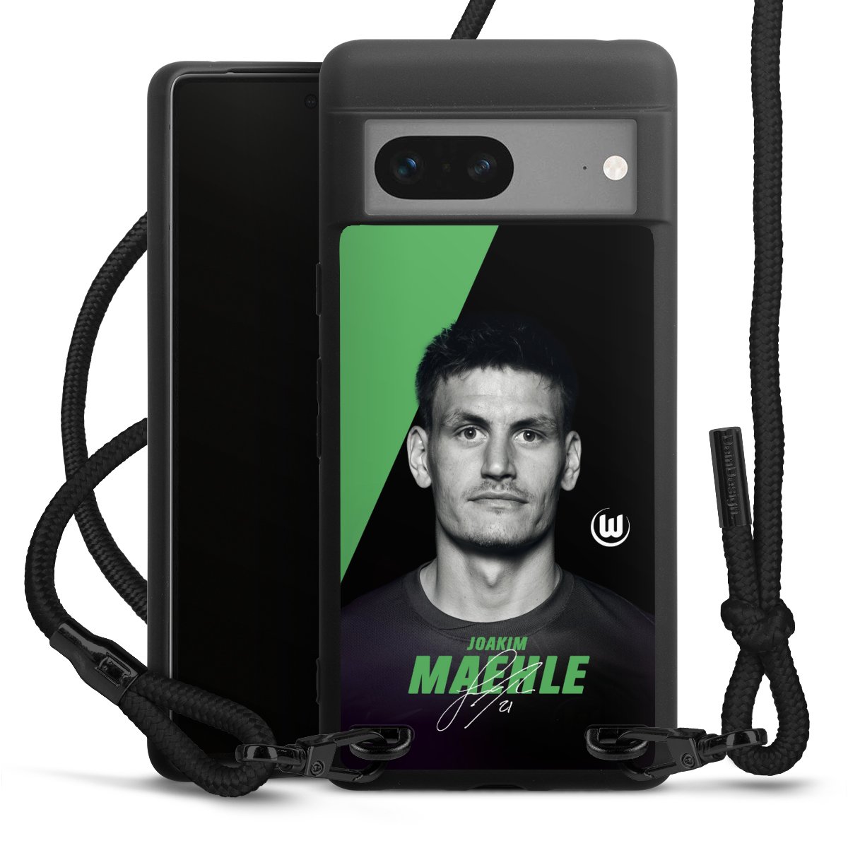 Pure Black: Handyhülle, Stoffband und Metalldetails in stylischem Mattschwarz.