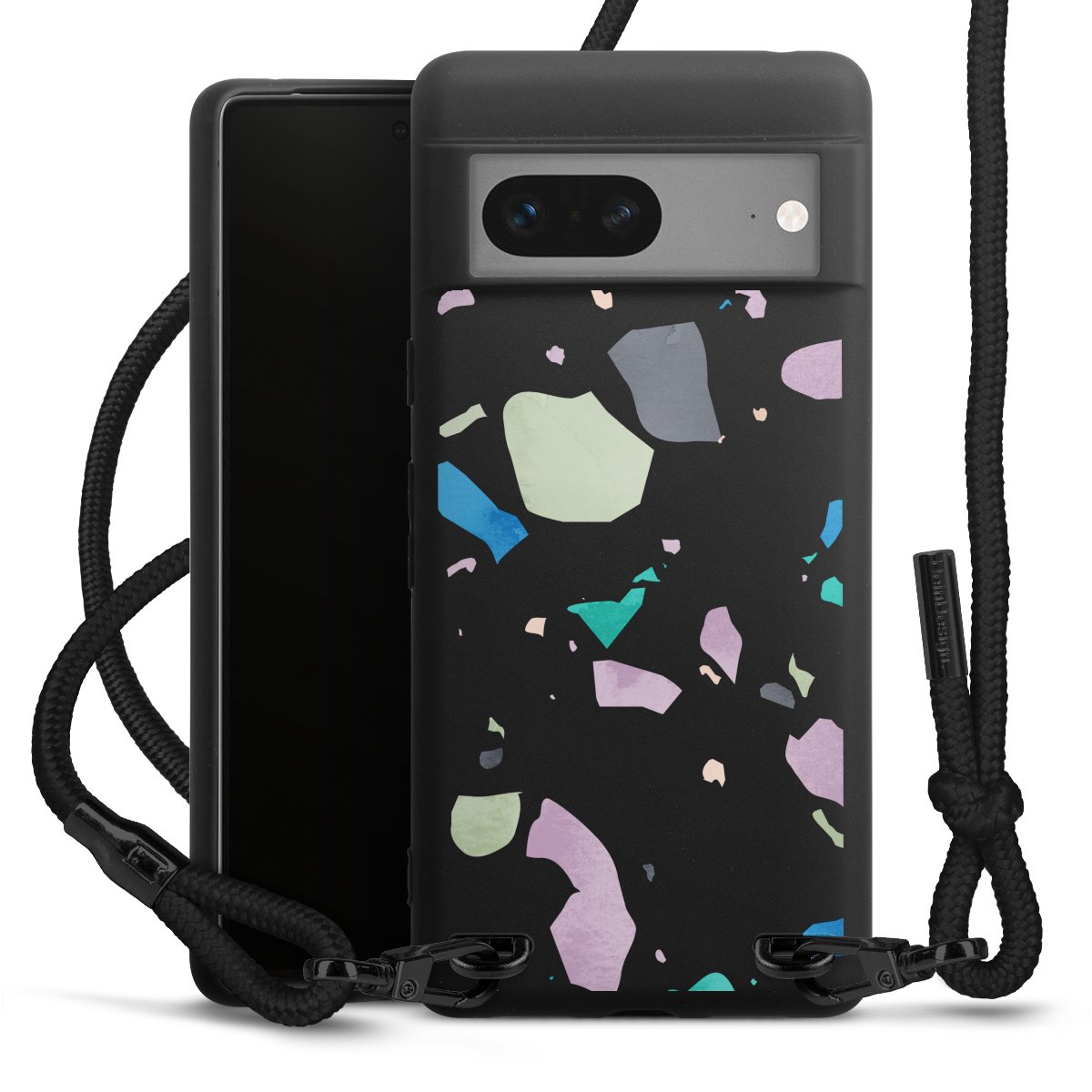 Pure Black: Handyhülle, Stoffband und Metalldetails in stylischem Mattschwarz.