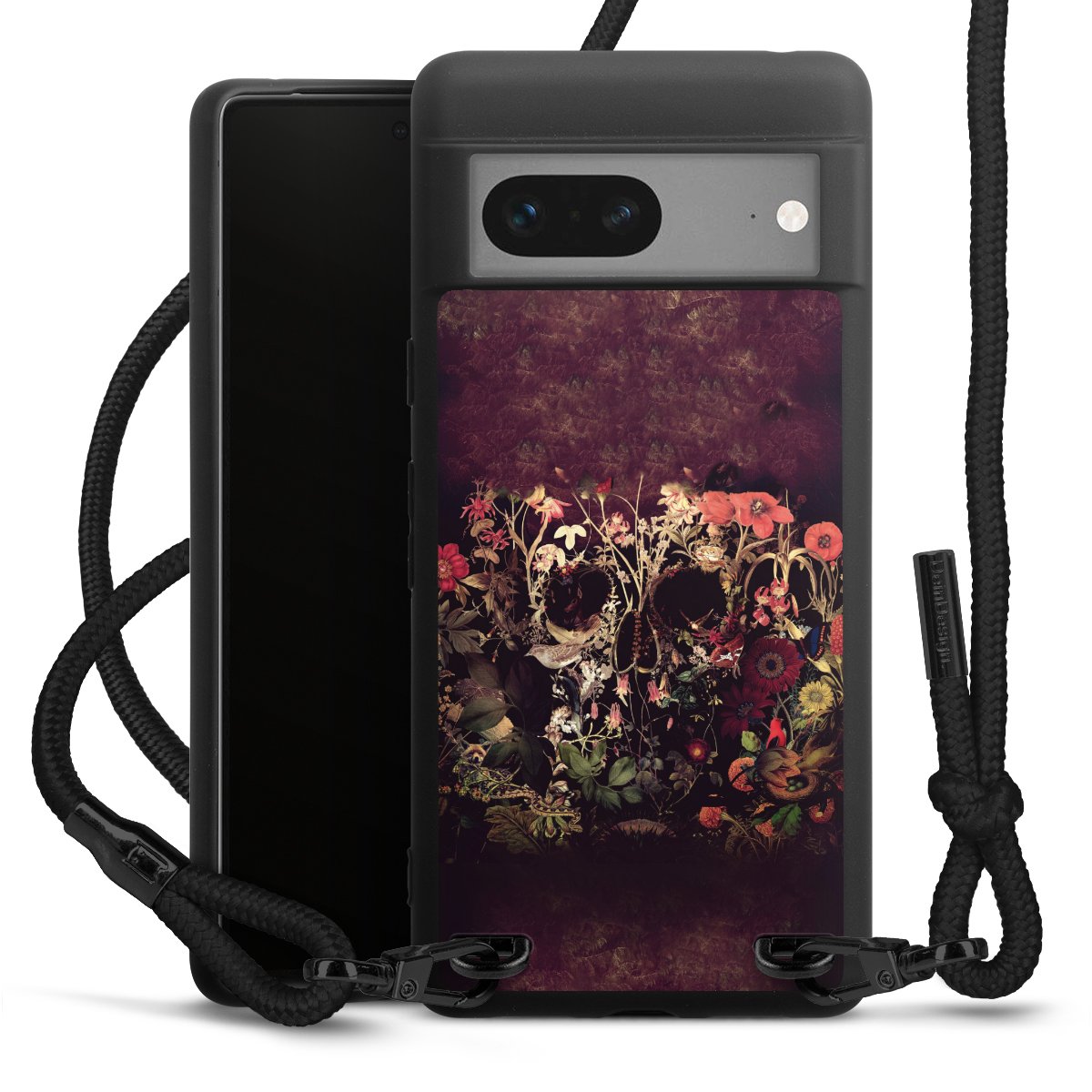 Pure Black: Handyhülle, Stoffband und Metalldetails in stylischem Mattschwarz.