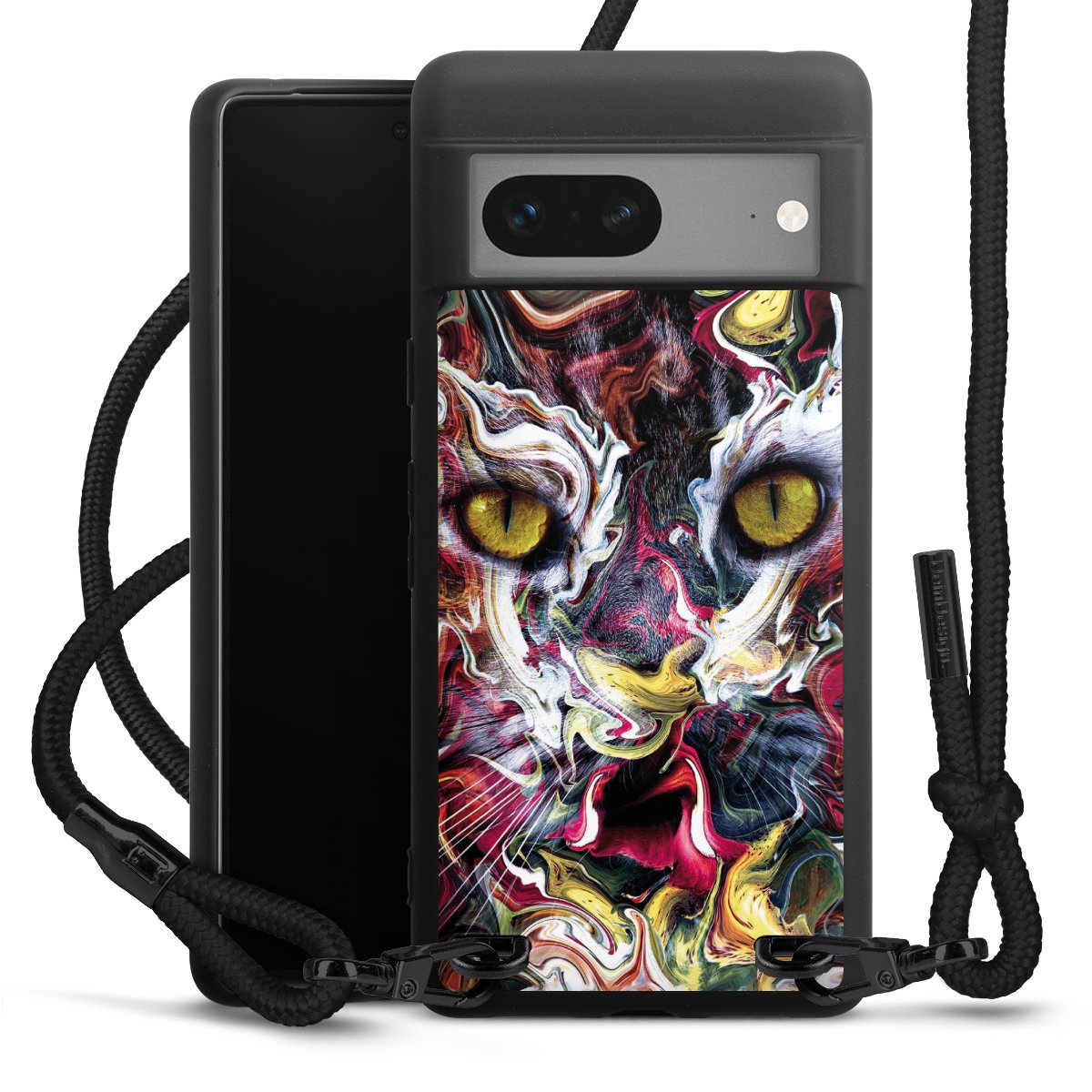 Die mattschwarze Silikonhülle besteht aus flexiblen TPU (thermoplastisches Polyurethan) und bietet robusten Schutz. Durch das langlebige, bruchsichere Material ist die Hülle biegsam und formbeständig zugleich. Die matte Oberfläche lässt Dein Design besser zur Geltung kommen und ist weniger anfällig für Fingerabdrücke und Schmutz. Das stylische Trend-Accessoire liegt griffig in der Hand und wird optimal von der Handykette aus Stoff (Polyester) ergänzt. Das geflochtene Stoffband ist ca. 1,70 Meter lang mit einem Durchmesser von ca. 0,5cm. Aufgrund der besonderen Knotentechnik ist das Band durch einfaches Ziehen in der Länge verstellbar. Als kleines i-Tüpfelchen haben wir das Band mit schicken Metall-Verschlüssen in Mattschwarz versehen.