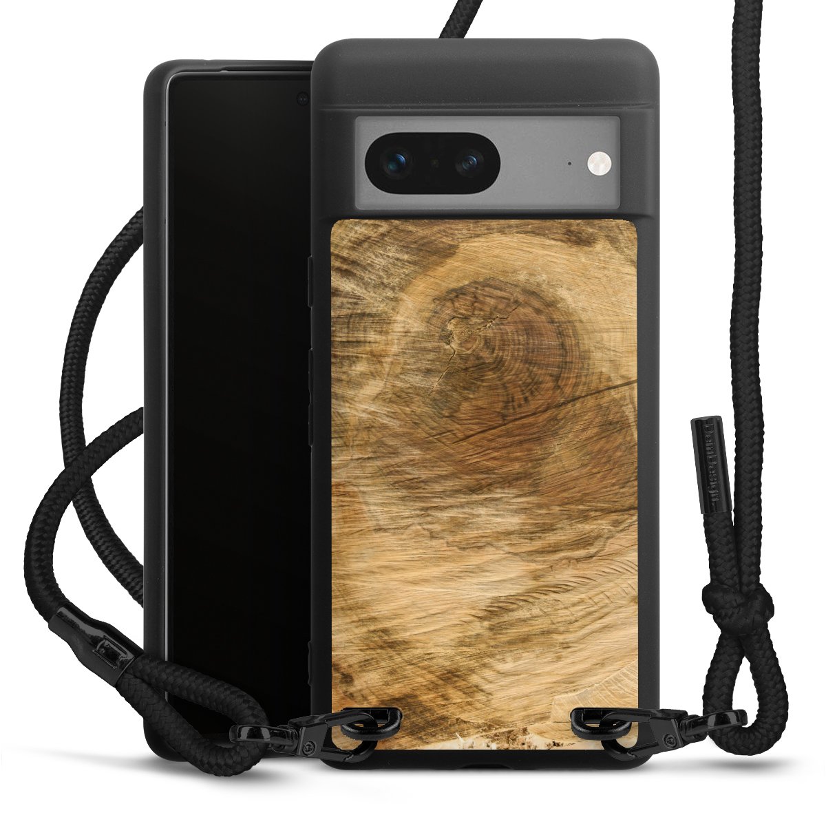 Pure Black: Handyhülle, Stoffband und Metalldetails in stylischem Mattschwarz.